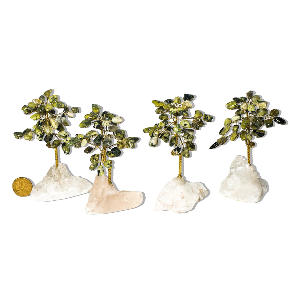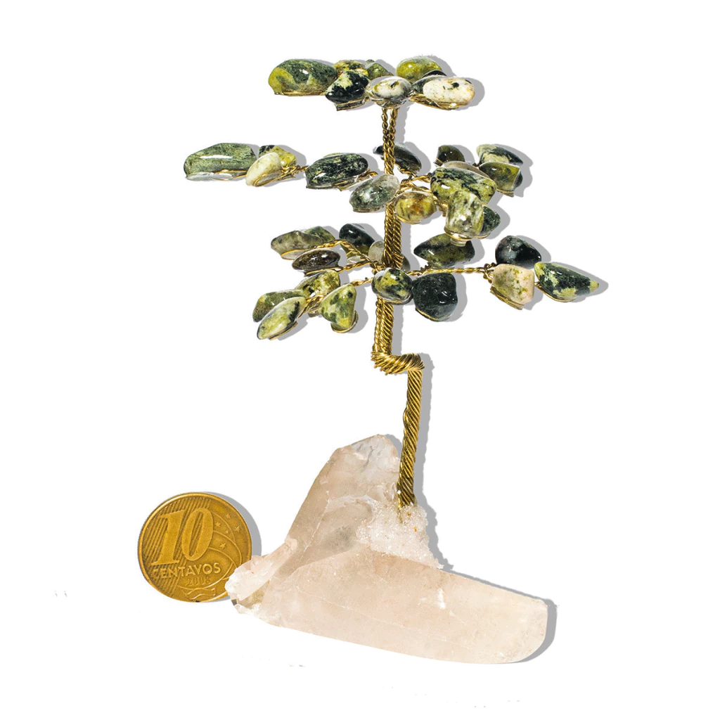 Adquira a Árvore da Felicidade feita com Pedra Jadeita Rolada Natural de garimpo, uma peça única e delicada que traz energia positiva e equilíbrio espiritual para qualquer ambiente. Cada árvore é cuidadosamente montada manualmente, com pedras de jadeita rajada verde, que possuem manchas pretas e são fixadas com resina em galhos de arame torcido, garantindo um visual único e cheio de significado. A base da árvore é composta por uma drusa de cristal, que realça ainda mais a energia regenerativa da peça.