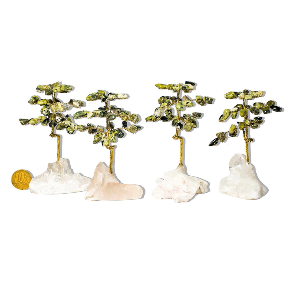 Importante: Como se trata de pedra natural, a jadeita pode apresentar variações de tonalidade e grafismos, o que faz com que cada árvore seja única. Além disso, pequenas inclusões que se assemelham a fissuras são comuns em minerais autênticos de garimpo e não comprometem sua qualidade ou beleza.