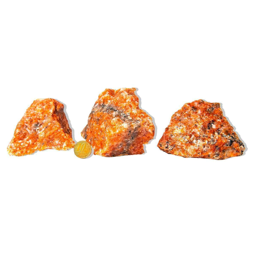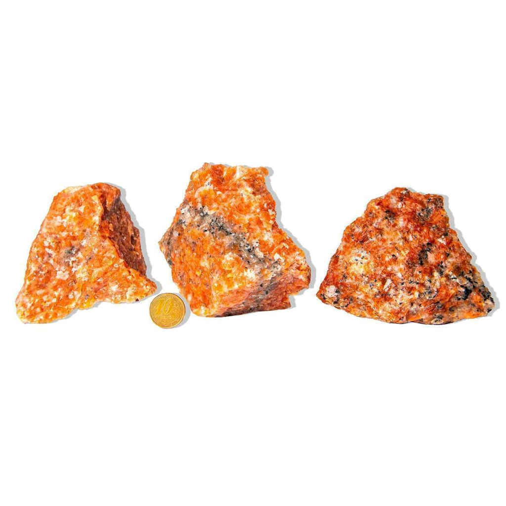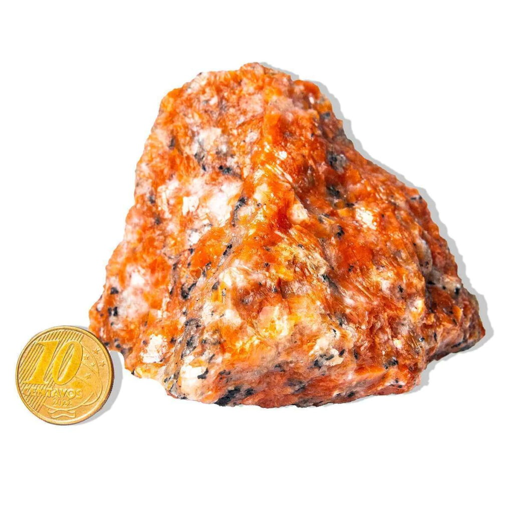 Cada unidade apresenta formato bruto e variações únicas, preservando toda a essência da natureza. A cor alaranjada é resultado da presença natural de óxido de ferro, o que torna cada pedra especial e única.