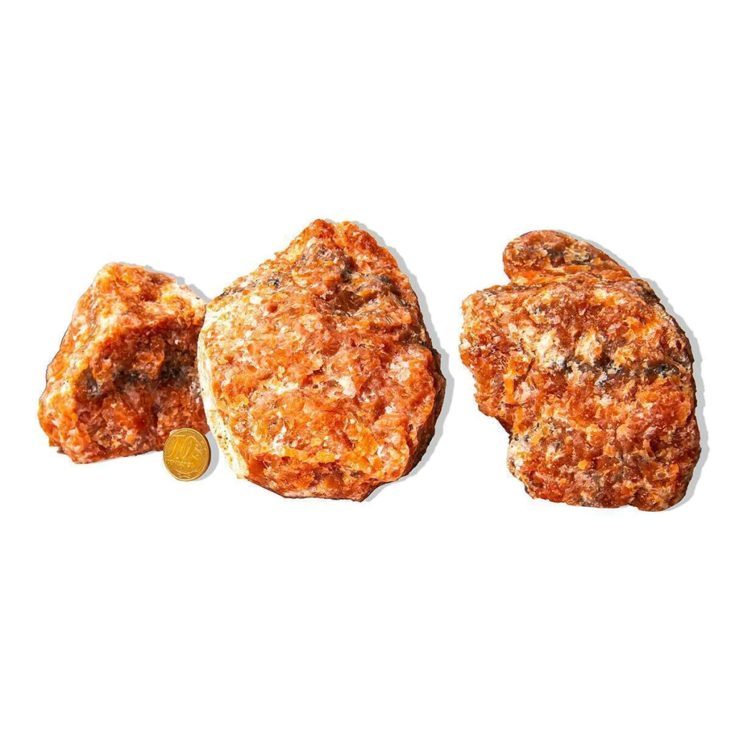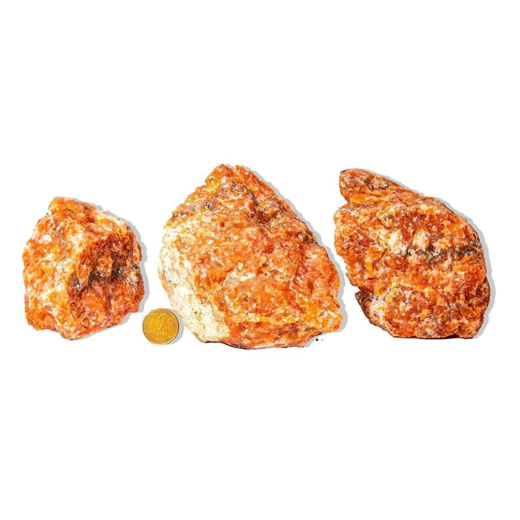 Cada unidade apresenta formato bruto e variações únicas, preservando toda a essência da natureza. A cor alaranjada é resultado da presença natural de óxido de ferro, o que torna cada pedra especial e única.