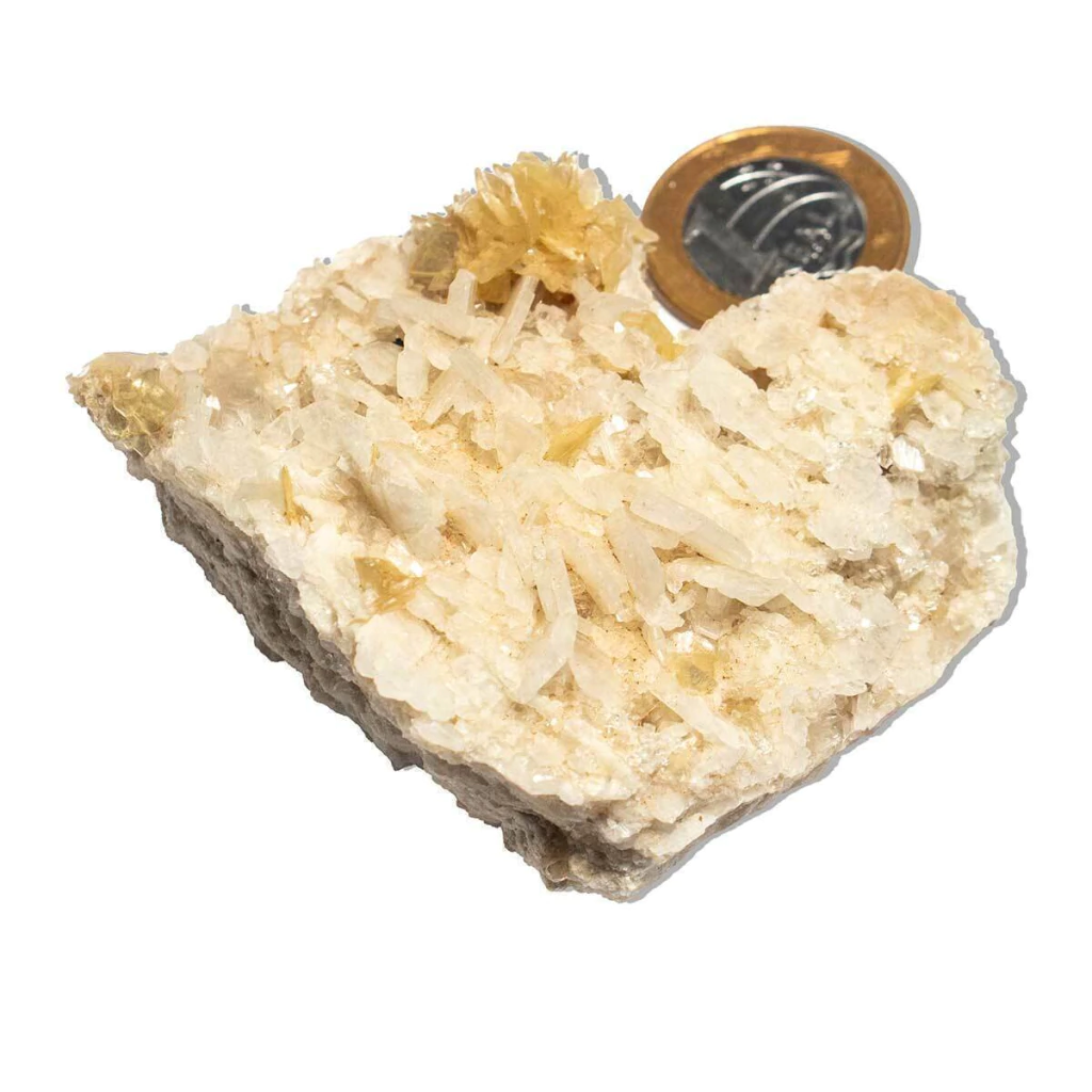 Drusa de Mica Amarela de excelente qualidade, com aglomerados naturais e algumas incrustações de cristais de quartzo (dependendo do exemplar, conforme foto). Este mineral autêntico é extraído da região de Araçuai, MG, e possui características únicas de brilho e cor.