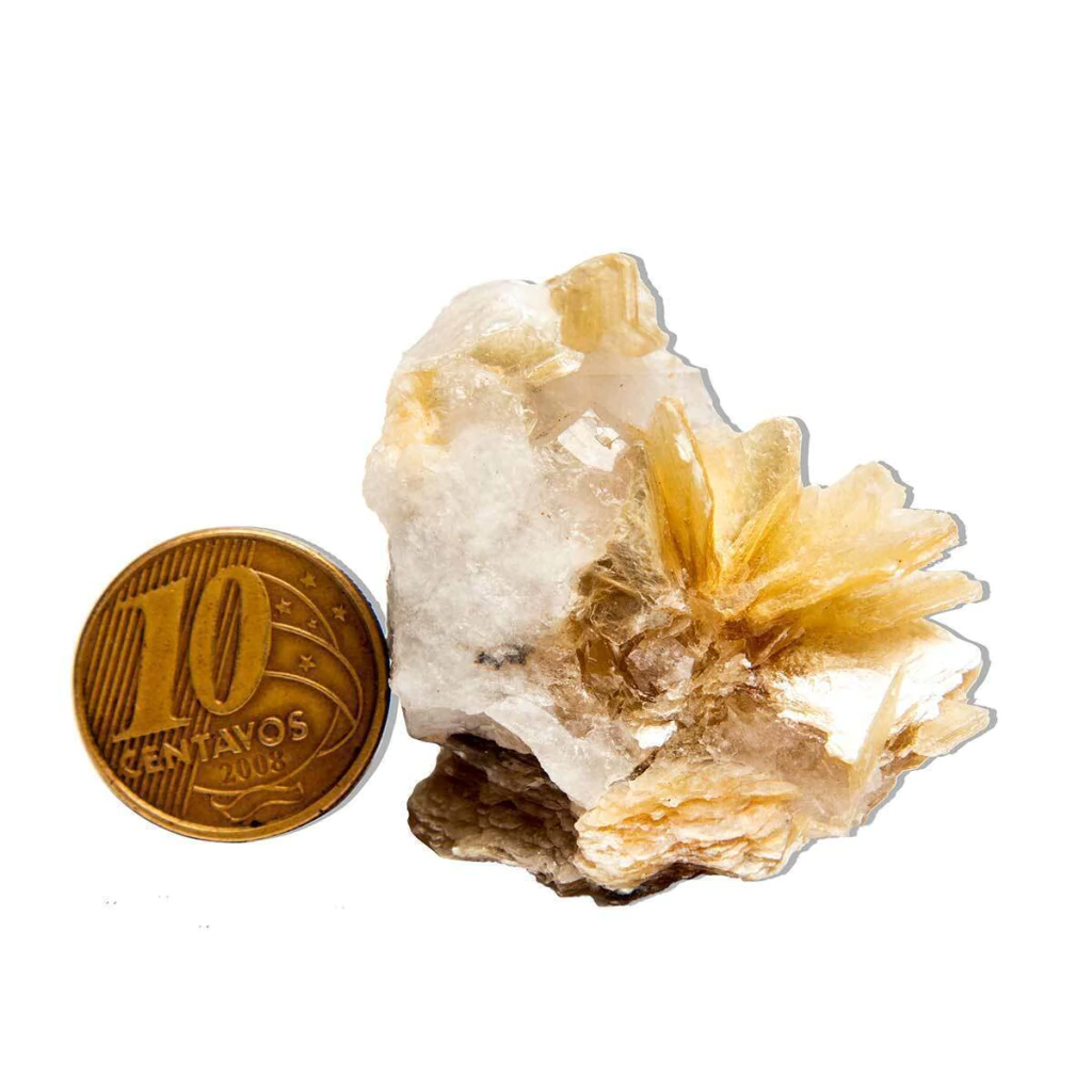 Drusa de Mica Amarela de excelente qualidade, com aglomerados naturais e algumas incrustações de cristais de quartzo (dependendo do exemplar, conforme foto). Este mineral autêntico é extraído da região de Araçuai, MG, e possui características únicas de brilho e cor.