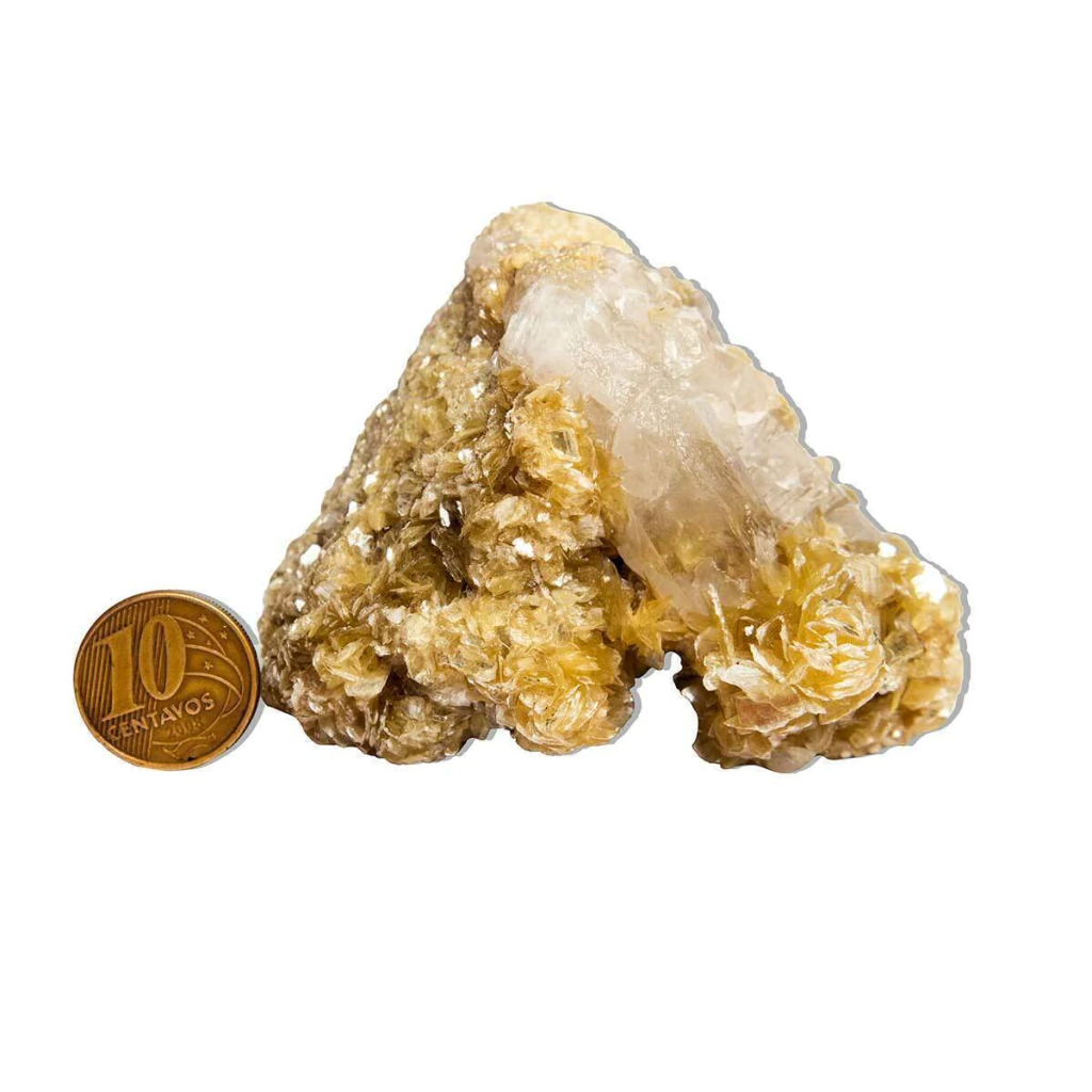 Drusa de Mica Amarela de excelente qualidade, com aglomerados naturais e algumas incrustações de cristais de quartzo (dependendo do exemplar, conforme foto). Este mineral autêntico é extraído da região de Araçuai, MG, e possui características únicas de brilho e cor.