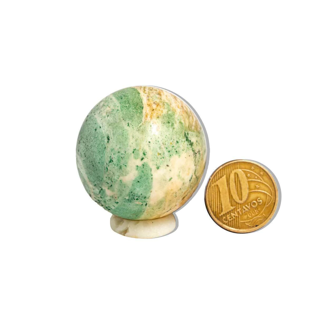Por ser uma pedra natural, cada esfera de Jadeita é única, podendo apresentar variações de tonalidade e grafismo. Pequenas inclusões, que podem parecer fissuras, são características normais de minerais autênticos extraídos do garimpo. Para manter a beleza da pedra, é recomendado hidratá-la com óleo mineral.