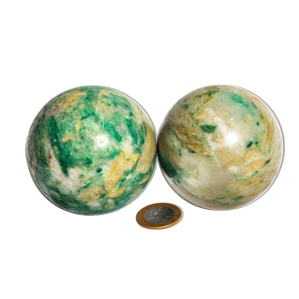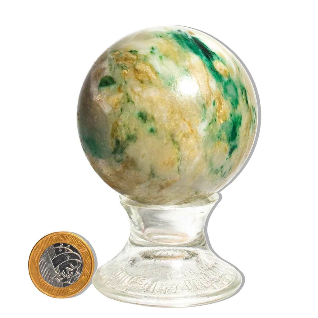Por ser uma pedra natural, cada esfera de Jadeita é única, podendo apresentar variações de tonalidade e grafismo. Pequenas inclusões, que podem parecer fissuras, são características normais de minerais autênticos extraídos do garimpo. Para manter a beleza da pedra, é recomendado hidratá-la com óleo mineral.