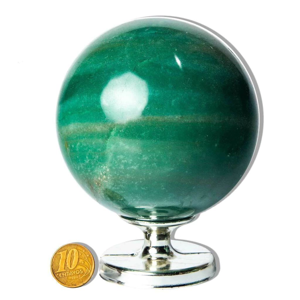 O Quartzo Verde é conhecido por transmitir uma sensação de frescor, vitalidade e harmonia. Sua tonalidade varia entre o verde claro e o verde musgo, com nuances e veios naturais que fazem de cada peça uma verdadeira obra da natureza. Esta esfera, cuidadosamente lapidada, reúne beleza estética e valor energético em um único item, perfeito para quem busca conexão com as energias da Terra.