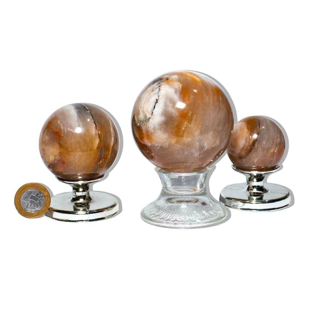 Pacote com pedras naturais de Aragonita Raio Laranja em formato esférico, lapidadas artesanalmente em Curvelo – MG.