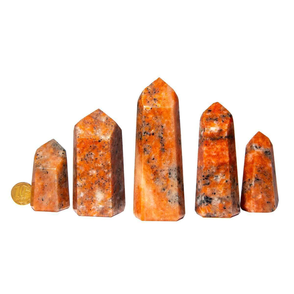 Adquira 1kg de Pontas de Calcita Laranja lapidadas manualmente em formato sextavado gerador. Cada pacote contém entre 4 a 7 pedras, podendo variar conforme o tamanho das peças disponíveis no estoque. Ideal para colecionadores, revendedores e uso decorativo.