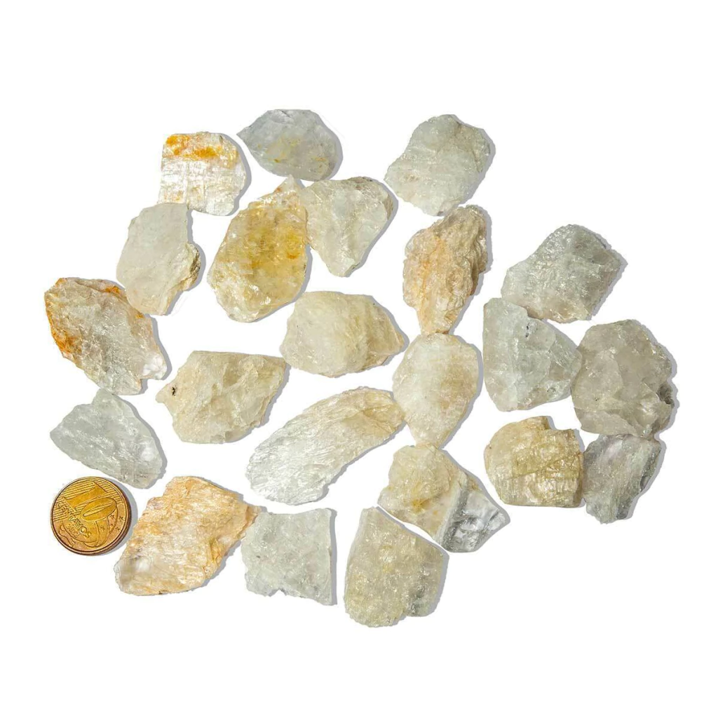 Por se tratar de um mineral natural, as peças apresentam variações de formato, tonalidade e textura. Podem conter áreas rústicas, fissuras naturais ou superfícies mais lisas, características típicas da Petalita em estado bruto.