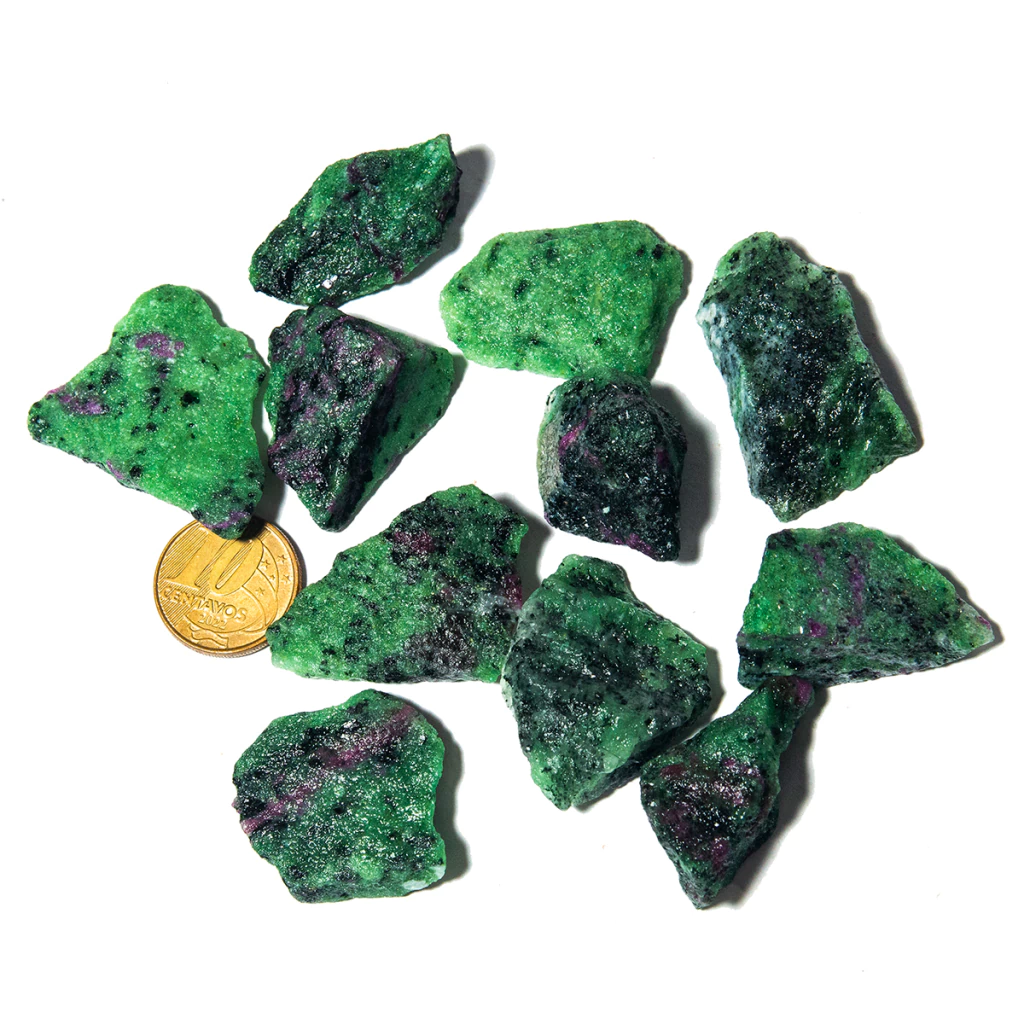 Perfeita para meditação, proteção espiritual, estímulo à vitalidade e conexão com a prosperidade, essa pedra é muito valorizada no mundo esotérico. Sua coloração vibrante mistura tons de verde (zoisita) com manchas e cristais vermelhos intensos (rubi), criando um contraste visual poderoso e encantador.