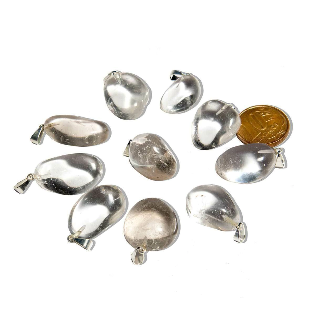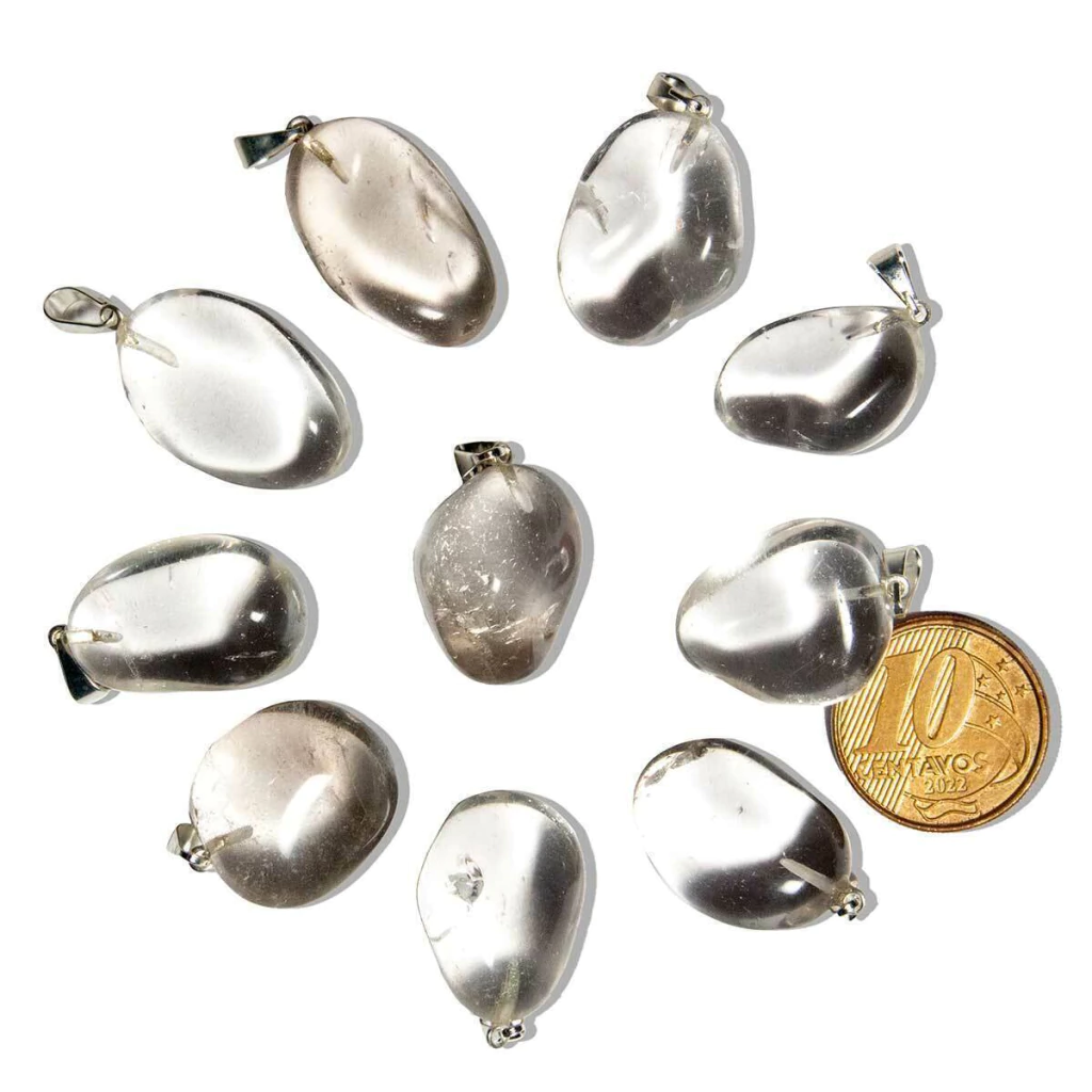 3 Pingente Pedrinha Quartzo Cristal exelente preço, lapidação rolado em vibrador montagem com pino e perinha Flash Prateado, recomendado para pulseiras ou crianças