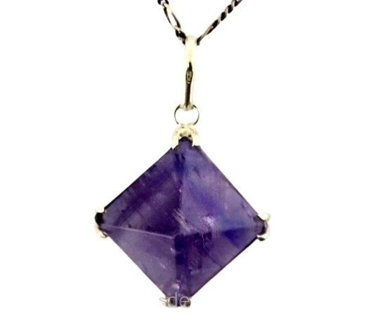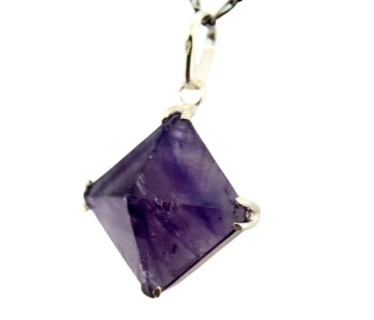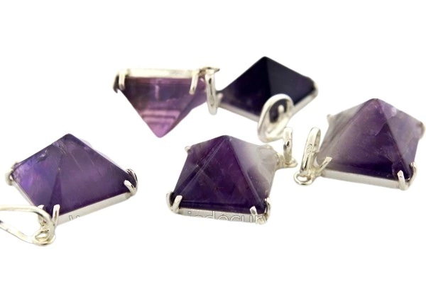 03 Pingente Pirâmide de Ametista com acabamento em Prata 950, uma peça elegante, sofisticada e poderosa que ajuda a equilibrar a mente e as emoções.