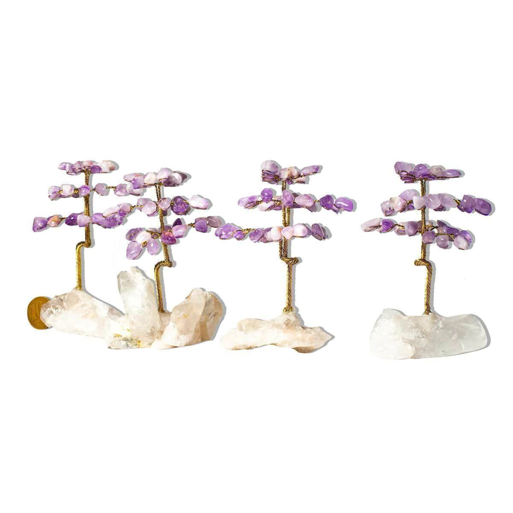 Conjunto com 4 Árvores da Felicidade artesanais, produzidas com ametista natural rolada e base de drusa de cristal de garimpo. Cada peça é feita à mão, com pedras coladas em galhos de arame torcido, finalizadas com resina e fixadas sobre uma base natural, formando um item decorativo exclusivo e delicado.