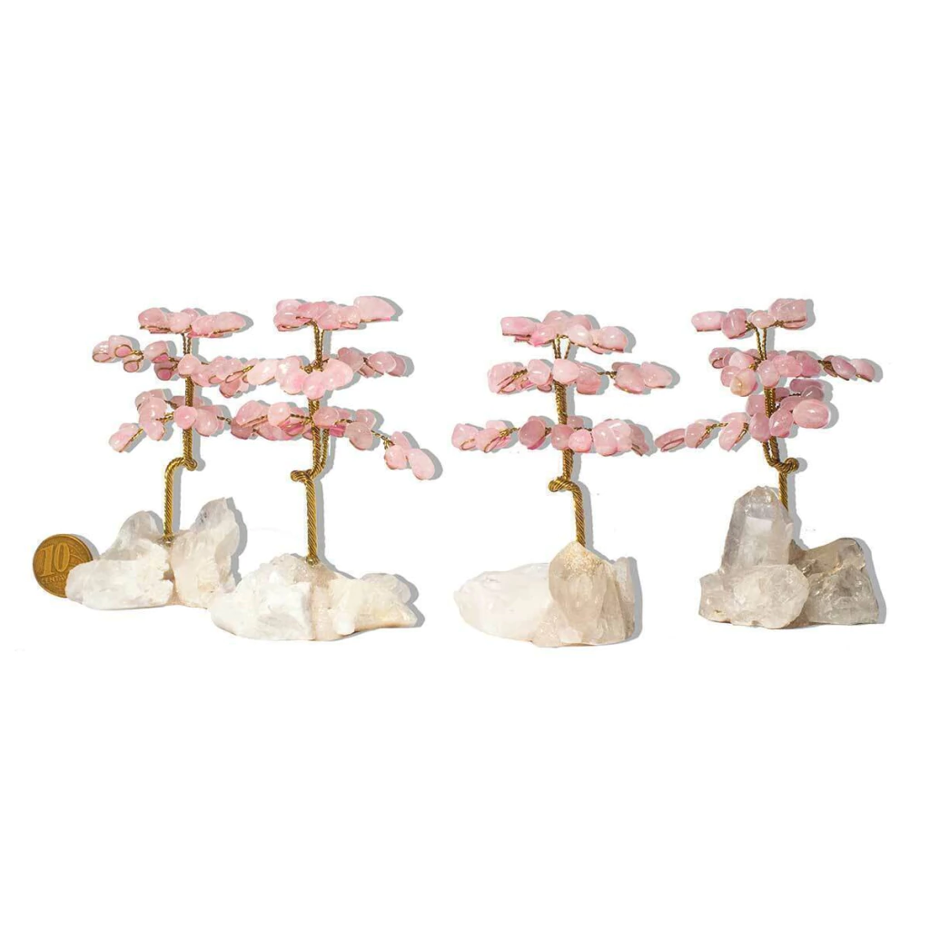 Conjunto com 4 árvores artesanais produzidas com pedras naturais de Quartzo Rosa rolado. As pedras são fixadas em galhos de arame torcido, com tronco montado sobre uma base de drusa de cristal natural. Ideal para revenda, decoração de interiores ou para oferecer como presente delicado e simbólico.