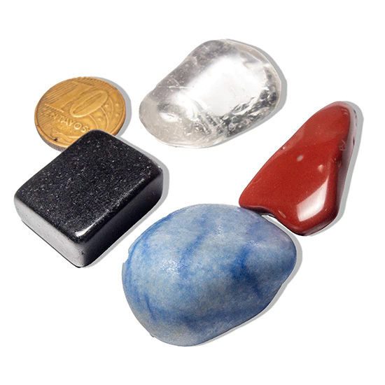 Kit de Cristais para Equilíbrio dos 4 Elementos – Quartzo Preto, Azul, Cristal e Jaspe Vermelho