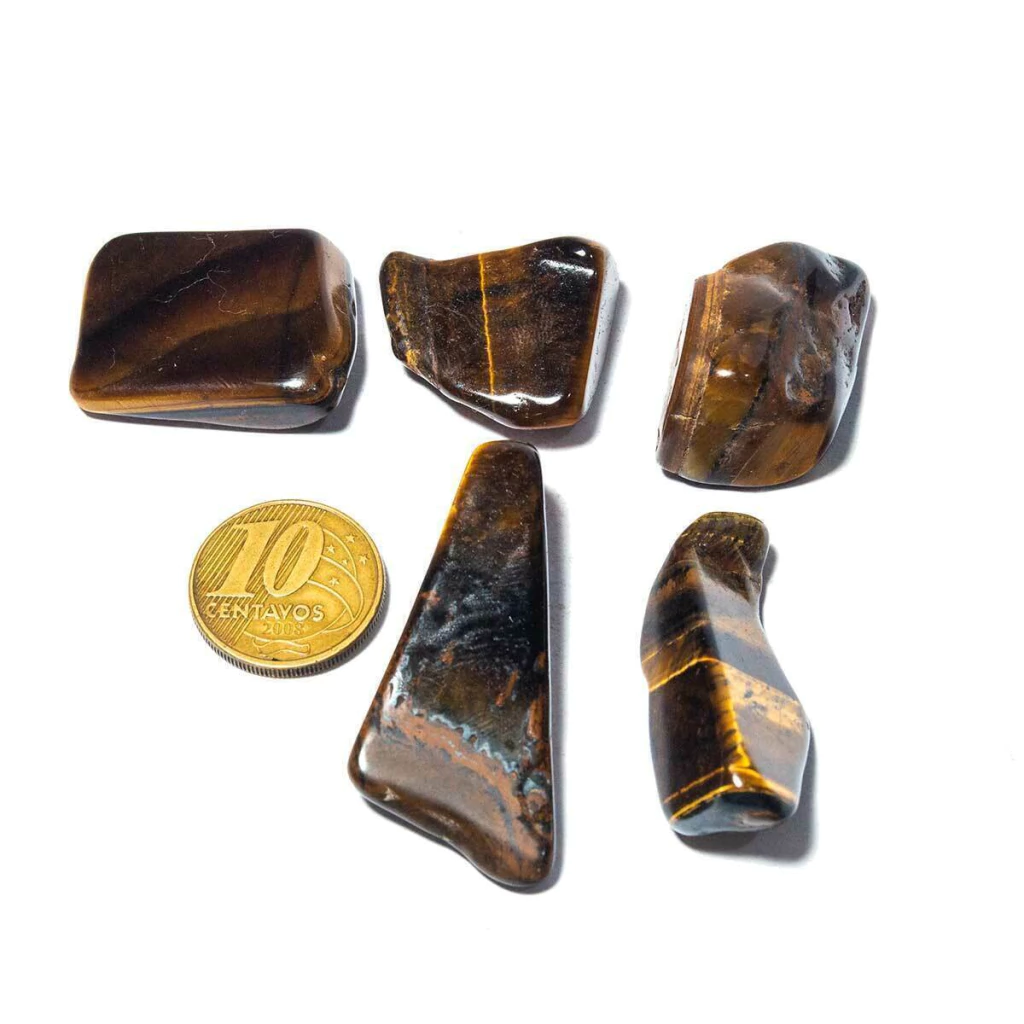 Adquira 5 unidades de Olho de Tigre Rolado, pedras naturais importadas da África e lapidadas artesanalmente em Curvelo, MG. Com brilho intenso e coloração marrom-dourada reluzente, estas pedras são ideais para colecionadores, artesãos ou uso esotérico.