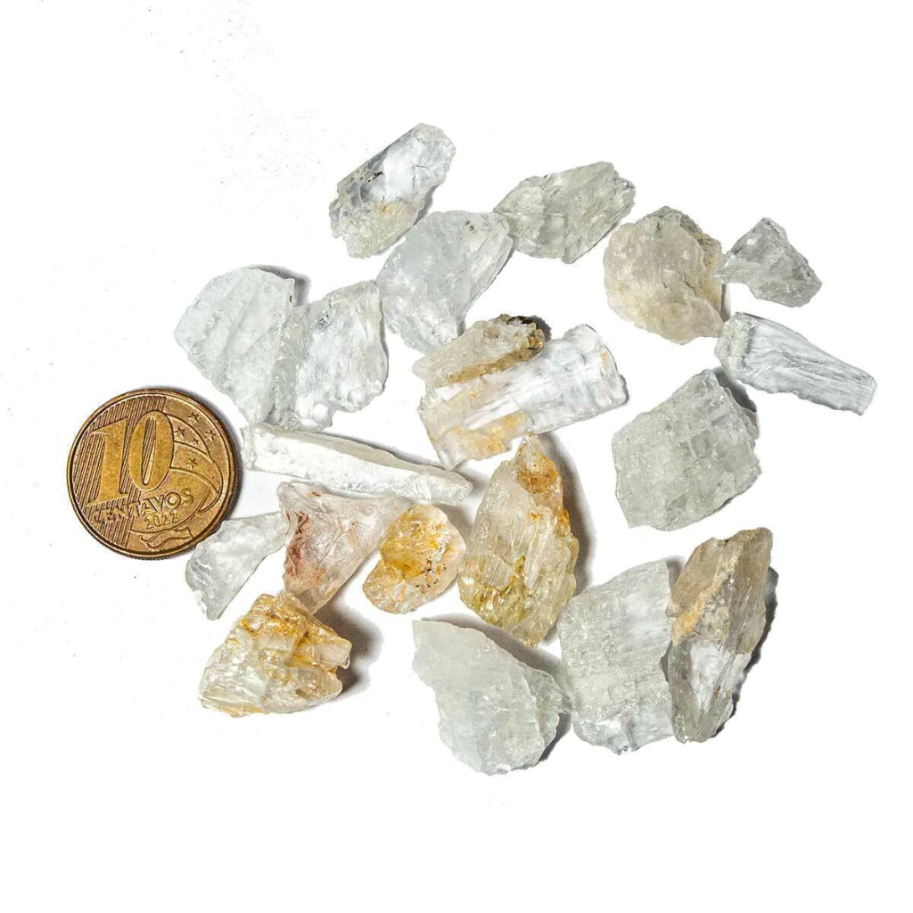 Por se tratar de um mineral natural, as peças apresentam variações de formato, tonalidade e textura. Podem conter áreas rústicas, fissuras naturais ou superfícies mais lisas, características típicas da Petalita em estado bruto.