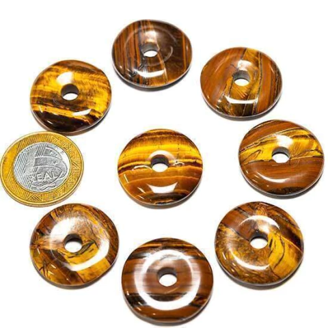 05 Pingente Pedra Pi Olho de Tigre Natural de Garimpo ATACADO, a Pedra Pi, também chamada de Donut ou Dona, é uma pedra plana, com um buraco no centro, em forma de donut ou rosquinha Esse Pingente é um portal dimensional, onde os Guardiões da Terra, Guerreiros do ArcoIris, têm acesso através das iniciações MunayKi Ela simboliza o ser humano, já que é uma representação do ”campo de energia luminosa“ Os Xamãs adotaram o conceito desta forma simbólica, e é uma crença comum entre eles em que estas pedras trazer boa sorte para aqueles que as utilizam Pedra Pi feito na Pedra Olho de Tigre com Valor já de Revenda, Não Acompanha cordão !