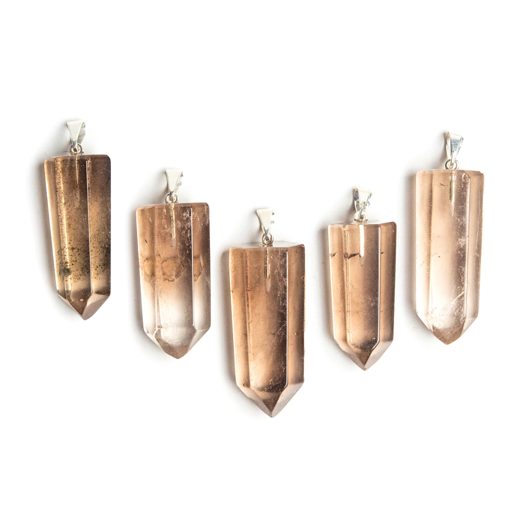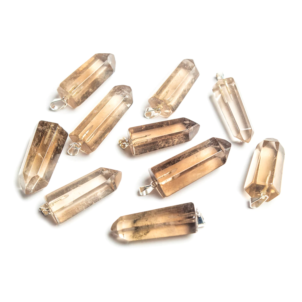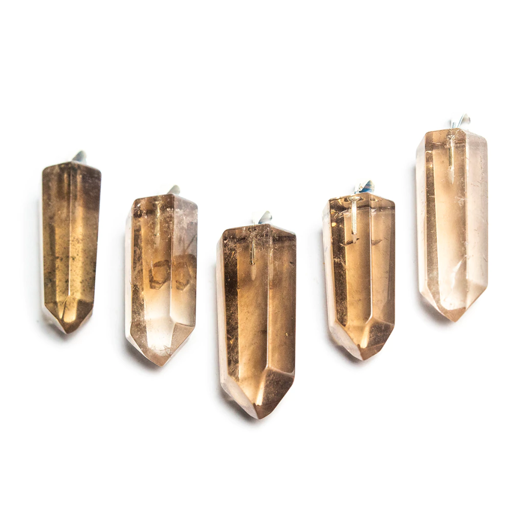 Pingente Pontinha Pedra Quartzo Fumê Presilha e Pino Prateado, Pontinha Sextavada Pedra Cristal de garimpo com lapidação artesanal montado com pino e Presilha com Banho Prateado, ideal para colar e pulseiras, ja vai montado