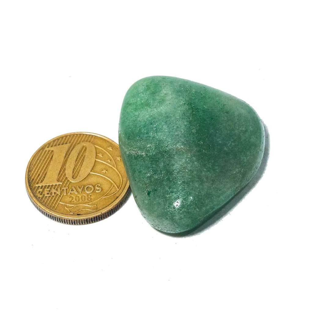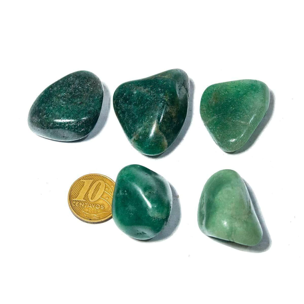Receba 5 unidades de Quartzo Verde rolado, com acabamento polido que realça o brilho e a intensidade do verde natural da pedra.