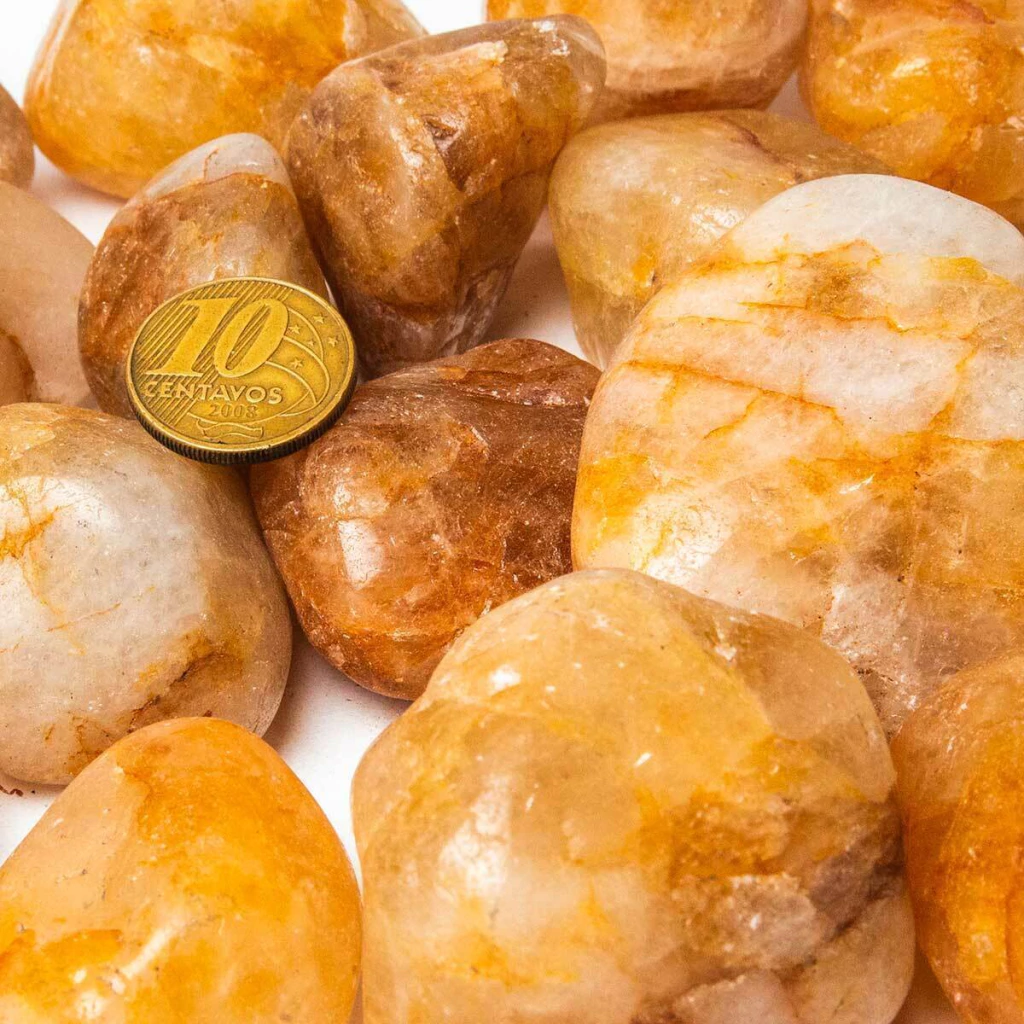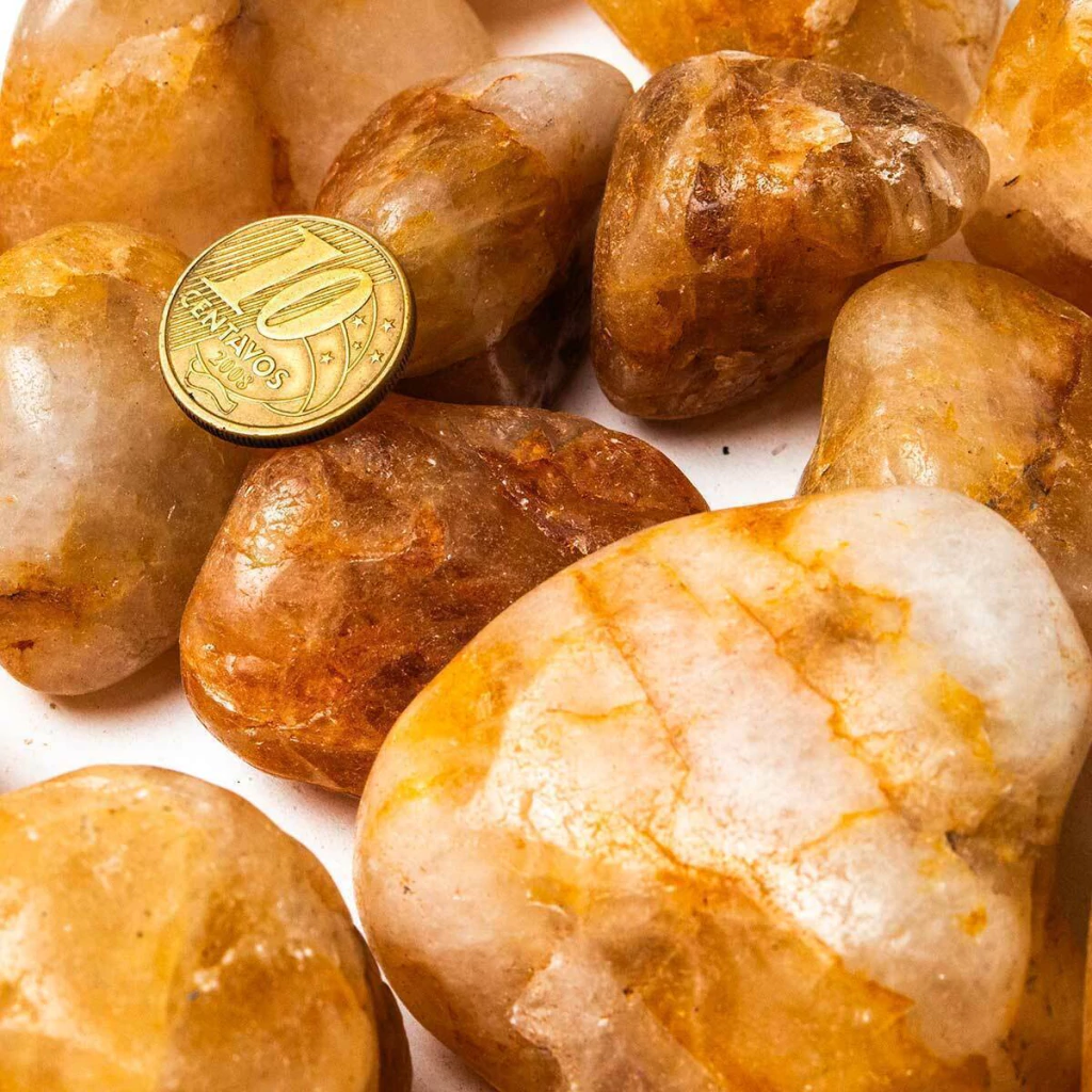 A Hematóide Amarelo rolada é uma pedra natural de garimpo, com tonalidades vibrantes de amarelo e um brilho único, ideal para uso esotérico e terapêutico. Sua lapidação em máquinas de rolagem oferece um acabamento perfeito, tornando-a excelente para a criação de pingentes, mandalas e outros artesanatos.