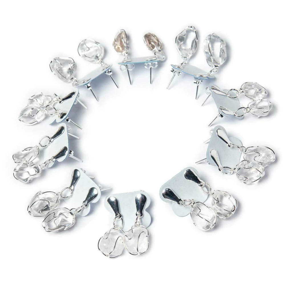A base metálica recebe acabamento prateado sobre metal niquelado, criando um contraste refinado que valoriza a transparência e o brilho vítreo da pedra.