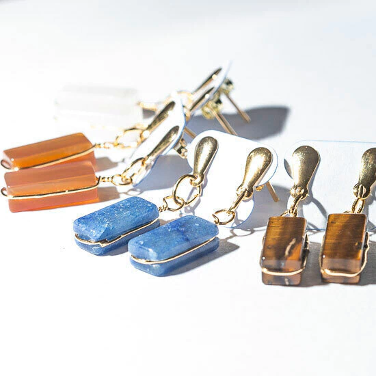 10 Brinco Pedra Mistas Lapidado Retangulo Ranhurado com pino e tarracha dourado, lapidação manual totalmente artesanal com polimento em vibrador a montagem é feita em banho flash dourado