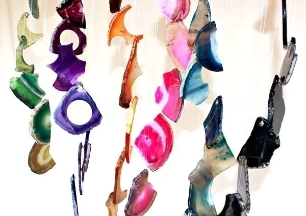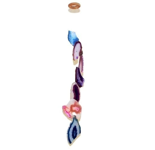 Conjunto com 10 unidades de mensageiros dos ventos produzidos com chapas de ágata em formatos variados. Cada peça é artesanal e feita a partir de retalhos de pedras naturais, aproveitando cortes irregulares com acabamento polido. Ao serem tocadas pelo vento, as pedras emitem um som suave que transmite uma sensação de leveza e serenidade ao ambiente.