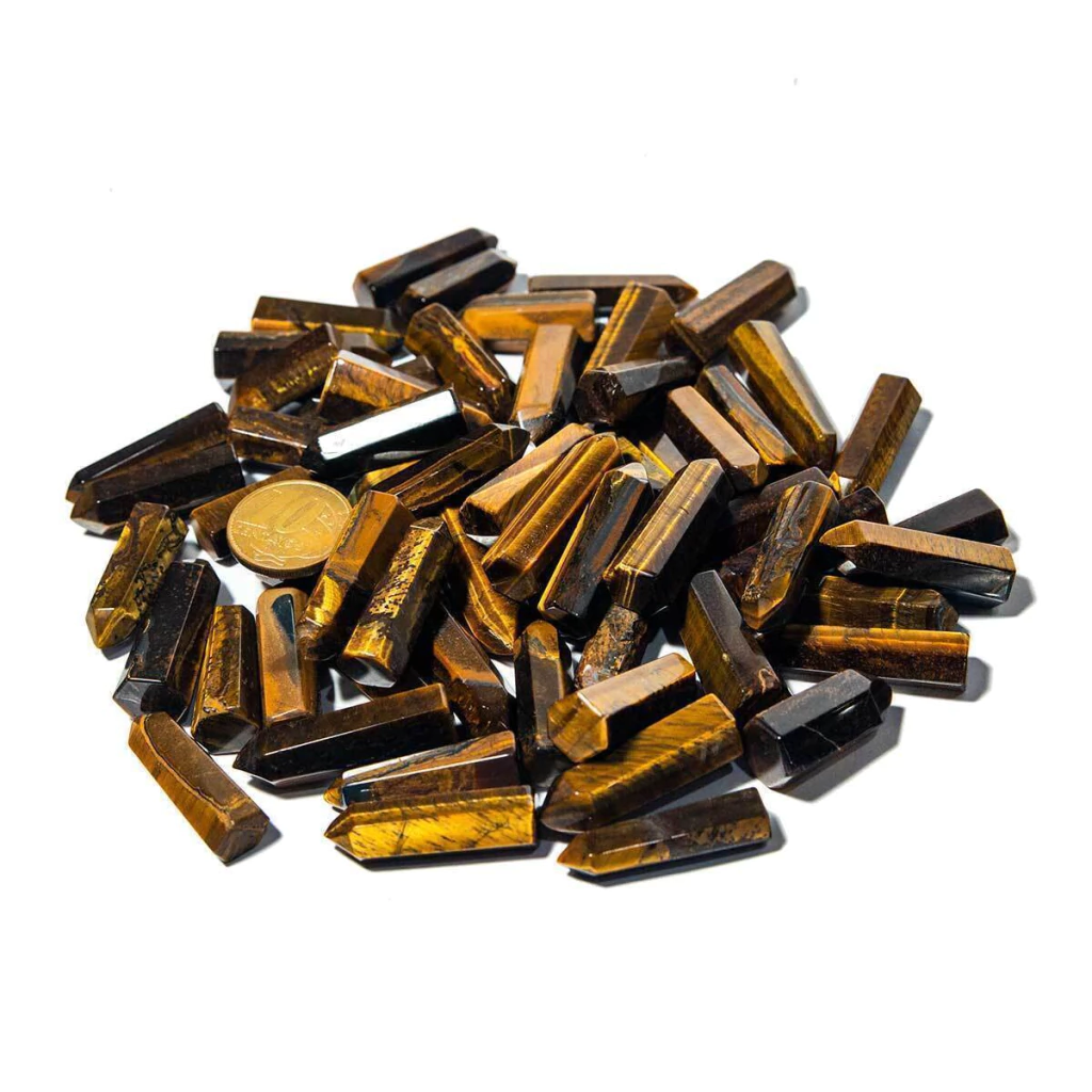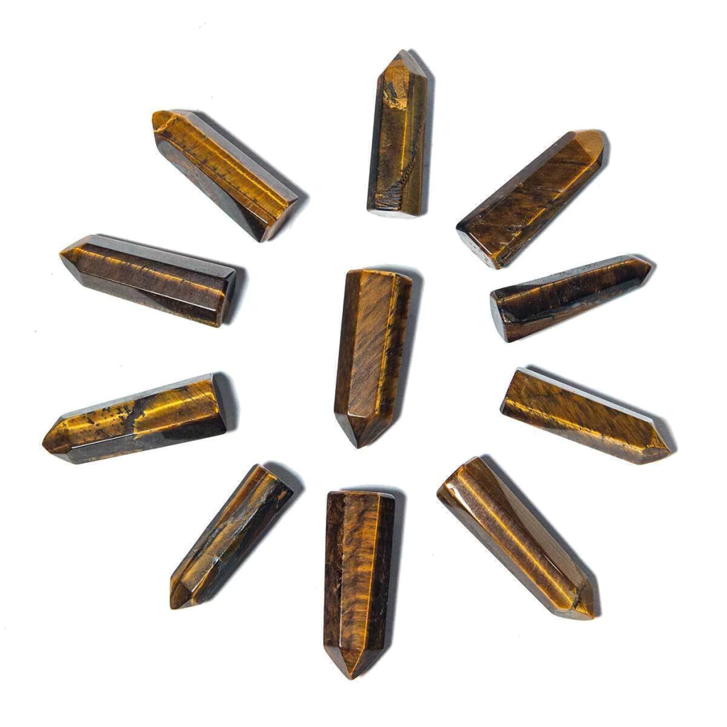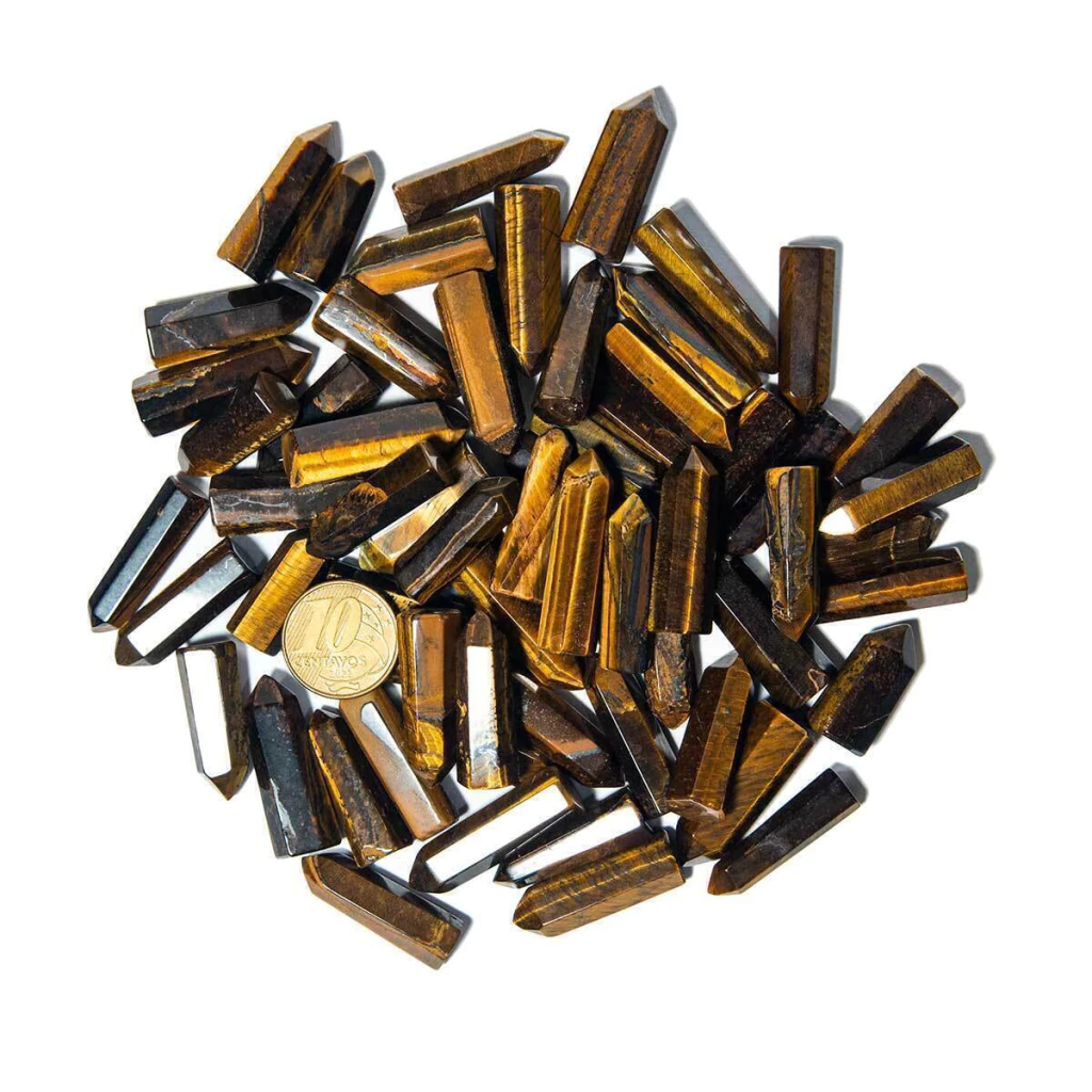 Conjunto com 10 pontinhas de Olho de Tigre natural, lapidadas no formato gerador com 6 faces e base reta, furadas manualmente por cima (espessura do furo: aproximadamente 1 mm). Perfeitas para montagem de colares, pulseiras, chaveiros, mandalas e orgonites.