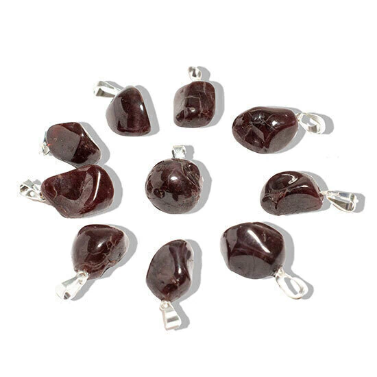 Este pacote contém 10 pingentes de Granada natural, com pedras em formato rolado e montagem em pino com acabamento banhado em prata. As pedras têm uma cor característica de vermelho escuro e possuem brilho opaco. Esses pingentes são ideais para pulseiras e podem ser utilizados também por crianças, devido ao seu tamanho compacto.