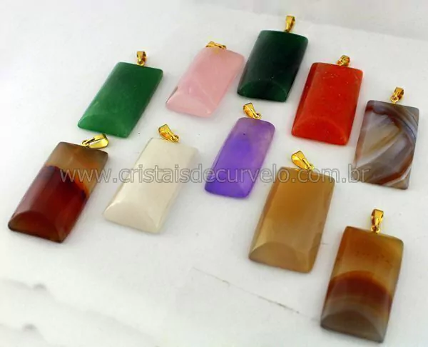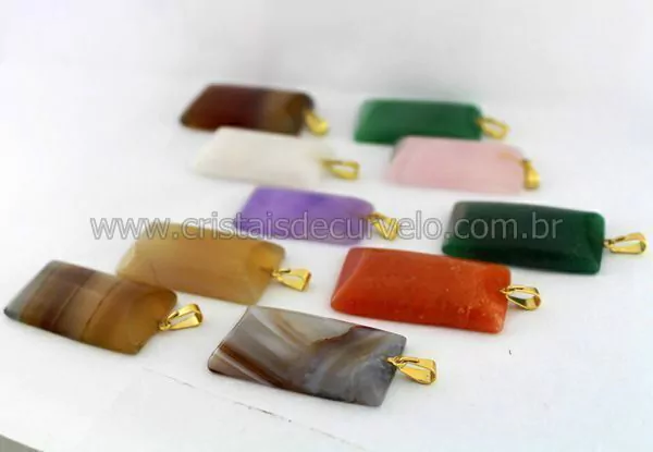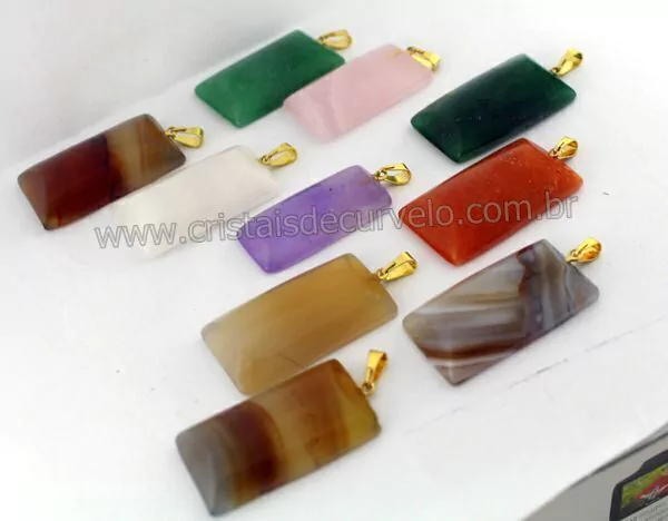 10 Pingente Misto Retangular Pedras Diversas pacote atacado Montagem Banho Flasch Dourado com pino e perinha para cordão, mineral de garimpo pedra com lapidação e montagem manual estilo artesanal