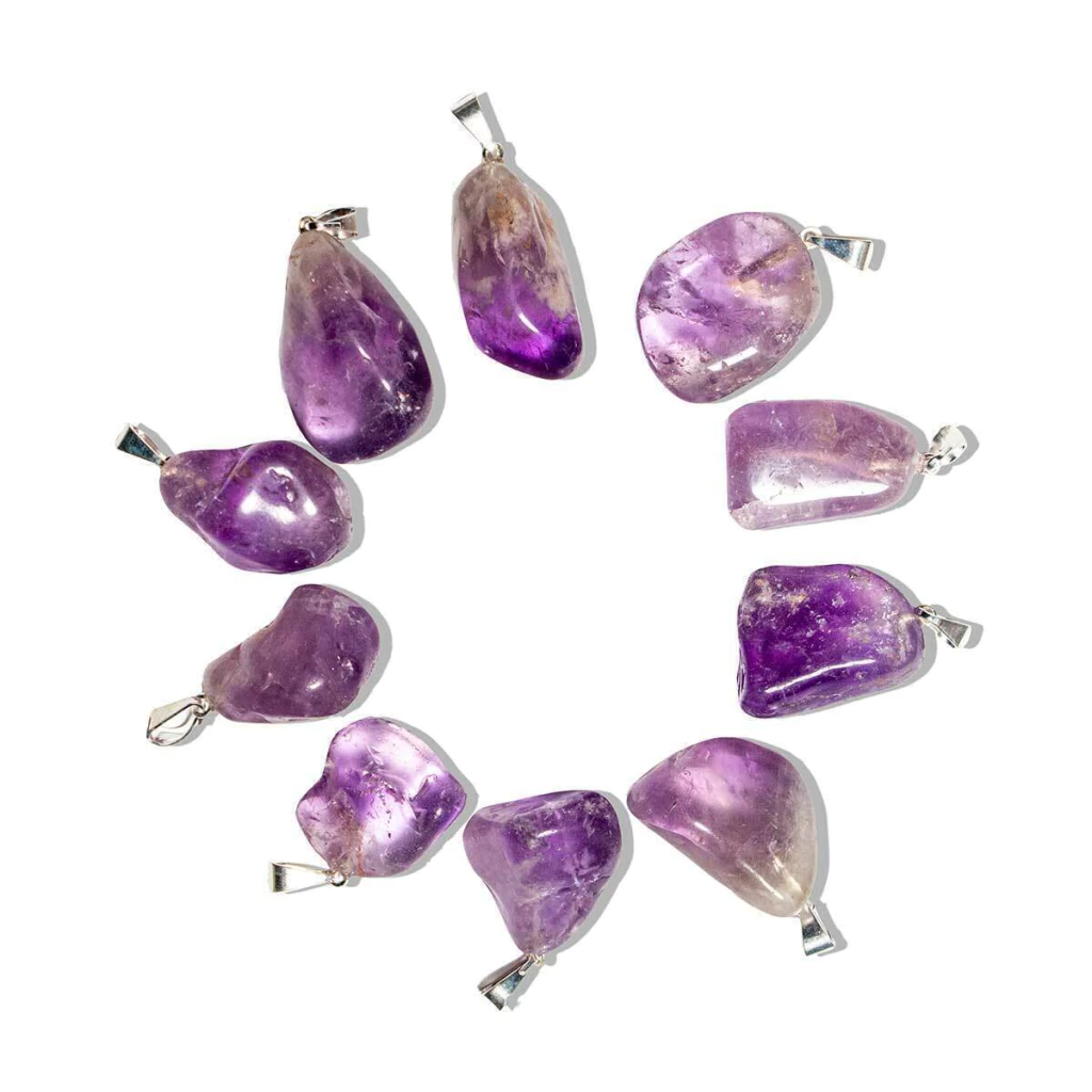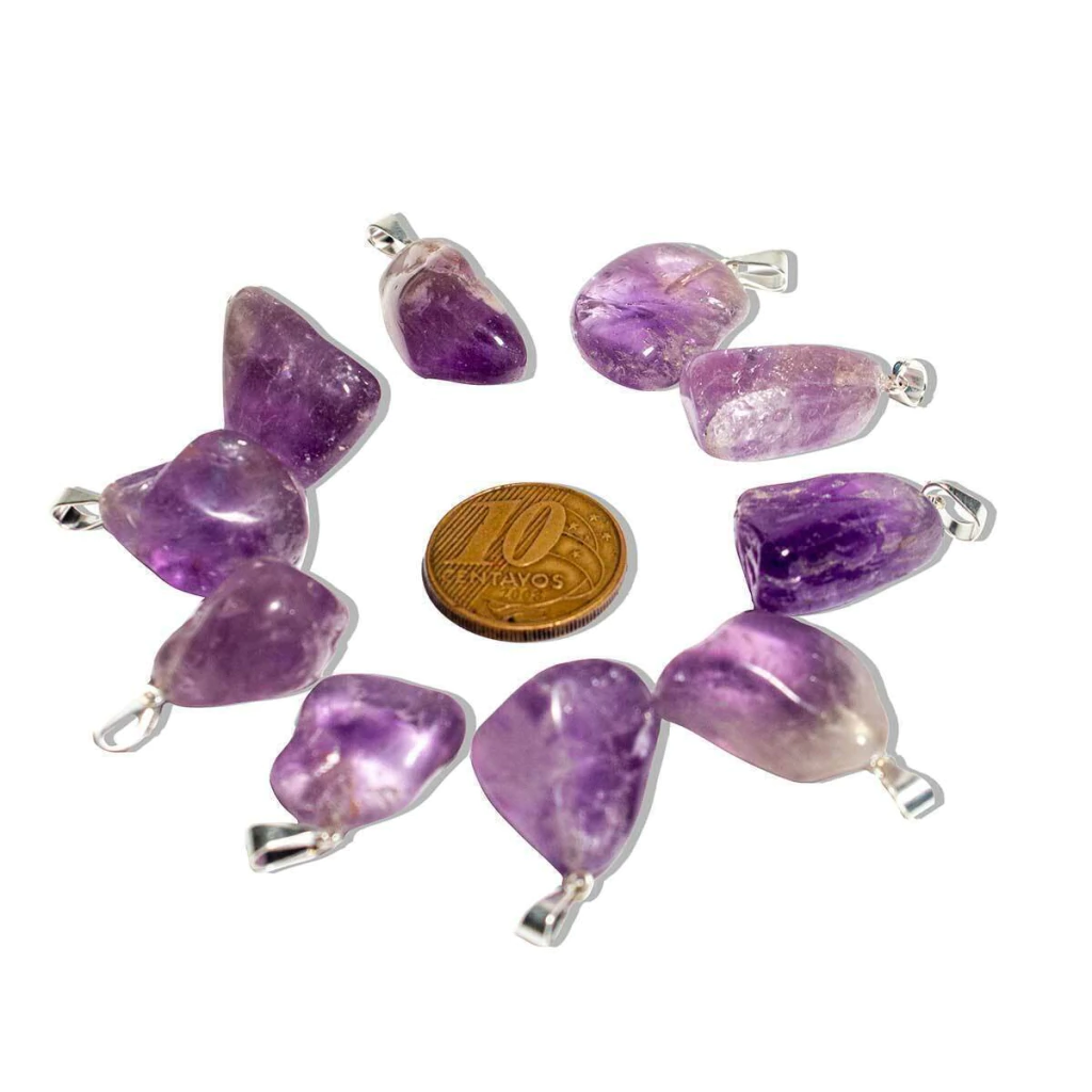 Adquira um conjunto com 10 pingentes de Ametista natural, perfeitos para pulseiras, colares ou acessórios infantis. Com lapidação rolada, cada peça possui acabamento com pino e argola no elegante prateado. Essa é a oportunidade ideal para quem busca beleza, energia e excelente custo-benefício.