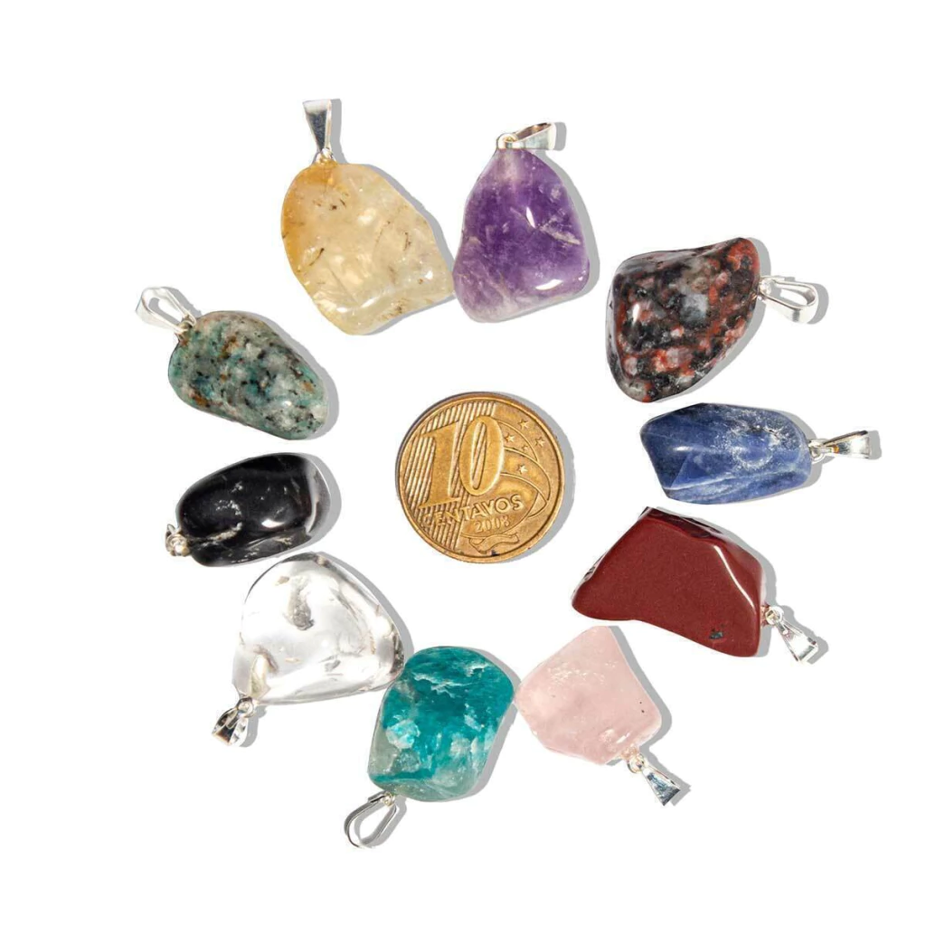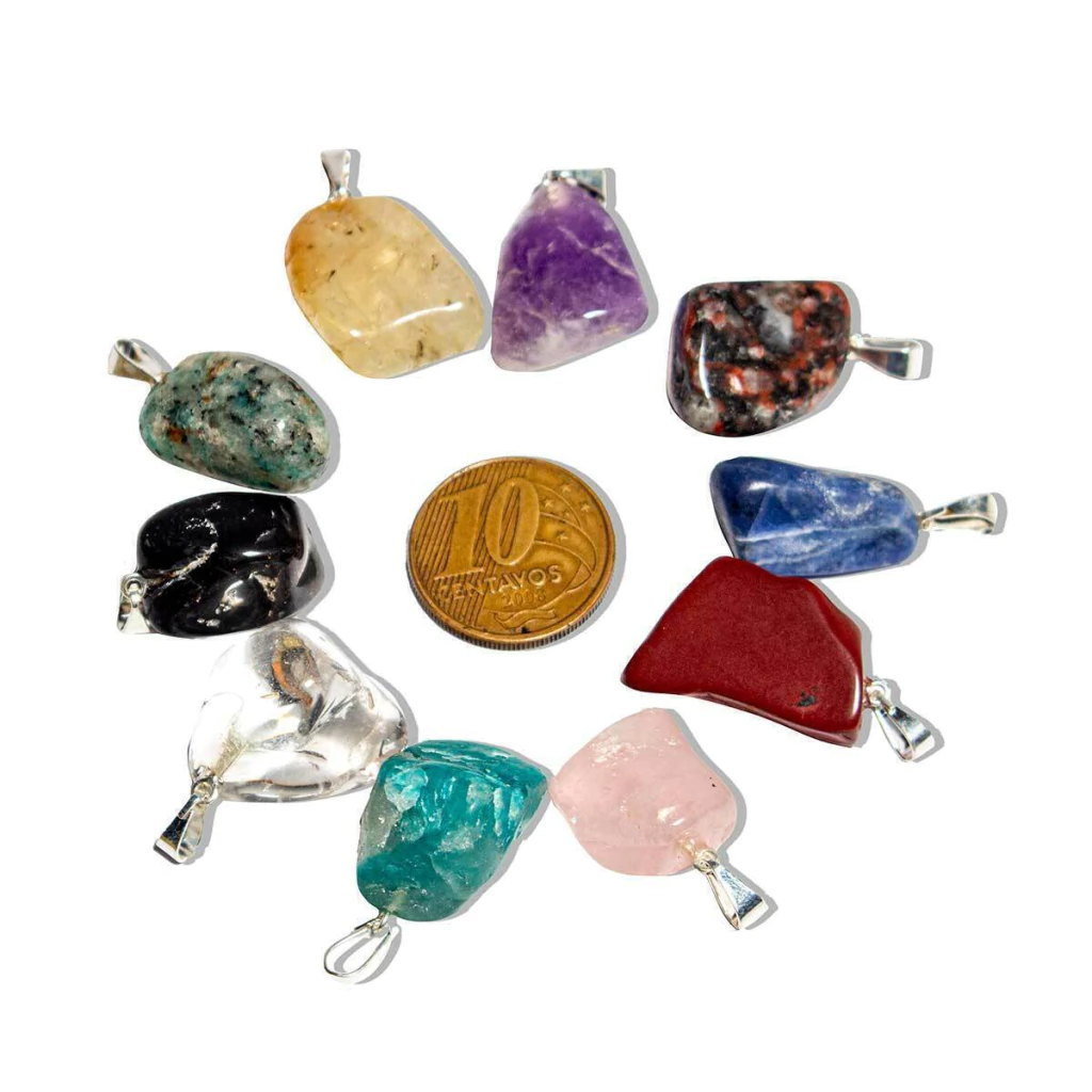 10 Pingente Pedrinha rolado MISTO natural mineral verdadeiro de garimpo exelente preço, lapidação rolado em maquina montagem com pino e perinha Flash Prateado, recomendado para pulseiras ou crianças Conforme estoque Olho de tigre, Hematita, Ametista, Rosa, Citrino, esmeralda, Agatas, leitoso, Morganita, Aguas Marinhas, Chevron, Turmalina Preta