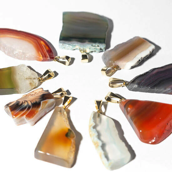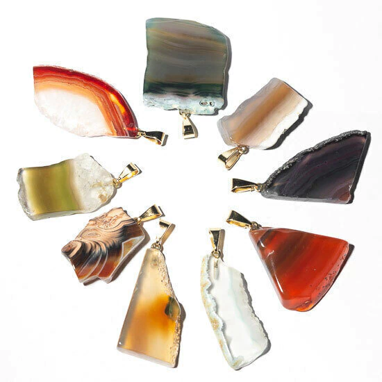 100 Pingente Chapa de Agata Mista Natural Montagem pino Dourado ATACADO, Valor para Atacado Pedra Natural da Familia da Calcedonia, pingente chapa polida, ideal para colar e pulseiras, ja vai montado com pino e presilha com banho flash dourado