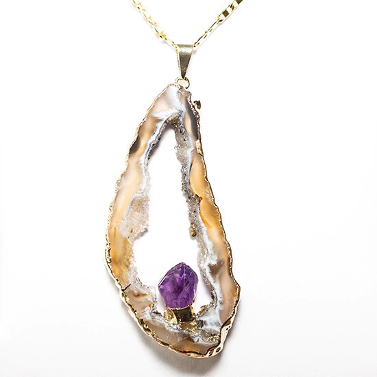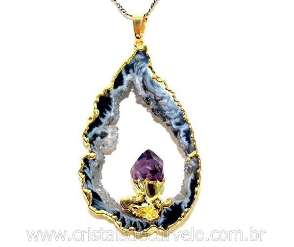 Pingente Chapa Geodo e Ponta de Ametista Especial Pedra Agata Natural Montagem Envolto com perinha para passar o cordão Pedra Genuina com origem garimpo lapidação e montagem Envolto em Dourado manual