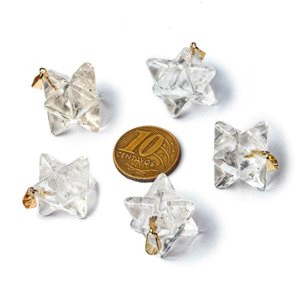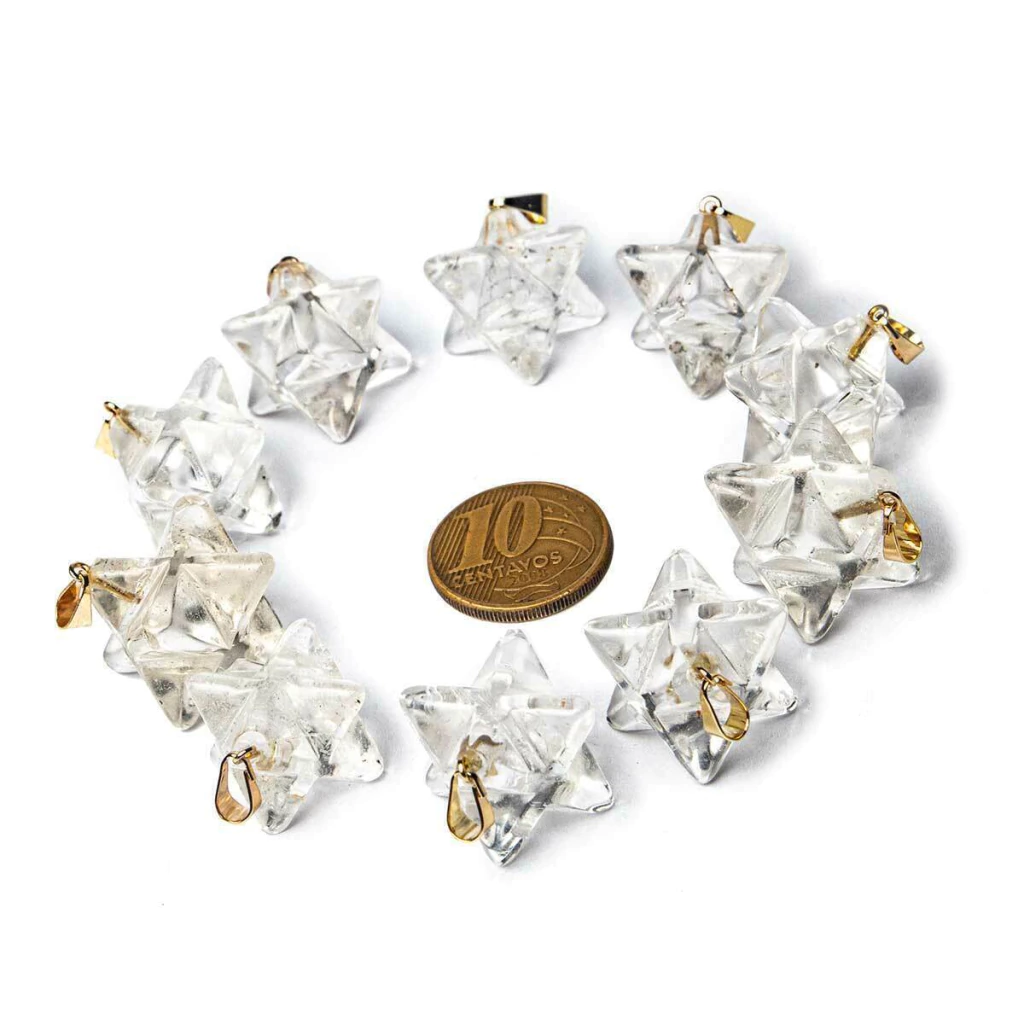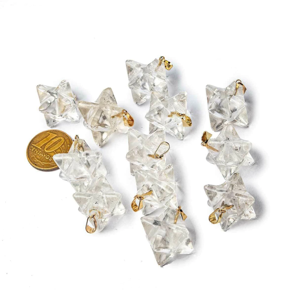 Lote com 100 Pingentes Estrela Merkaba em Quartzo Cristalino – Lapidação Artesanal com Pino Montado