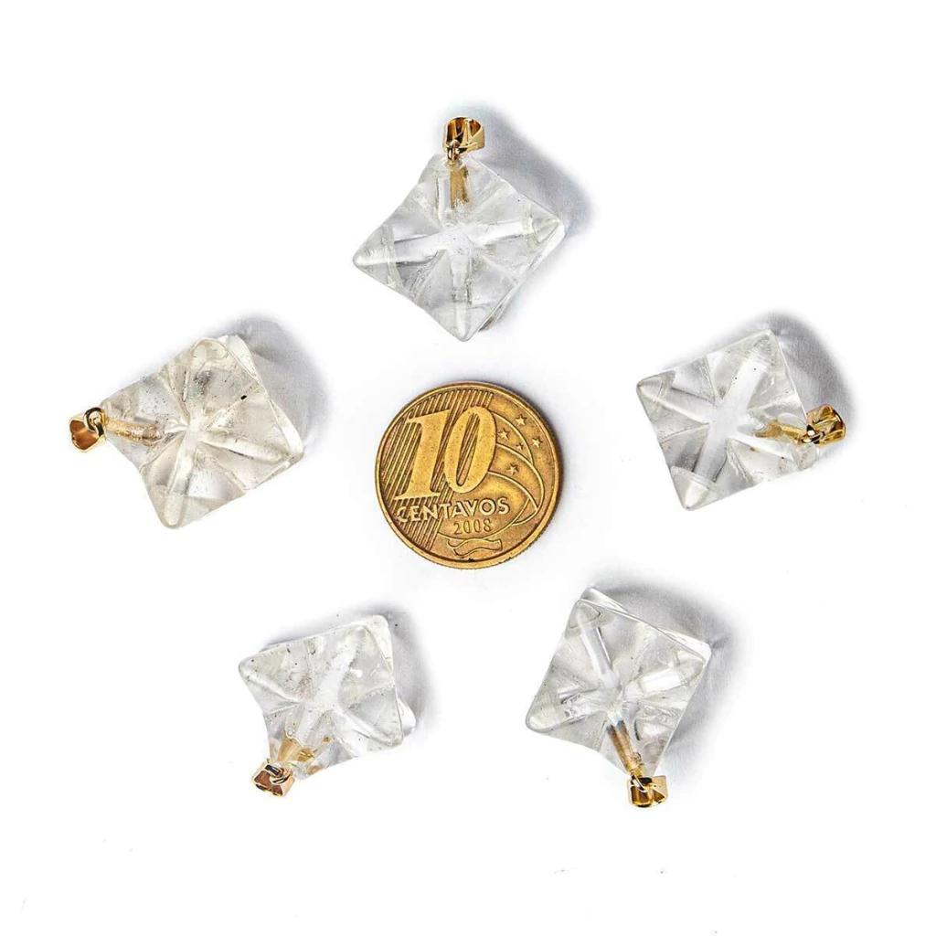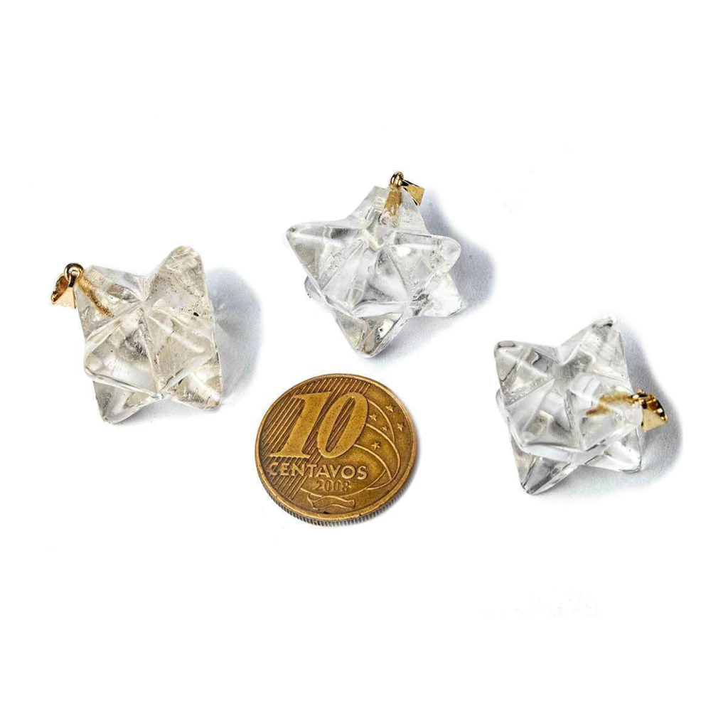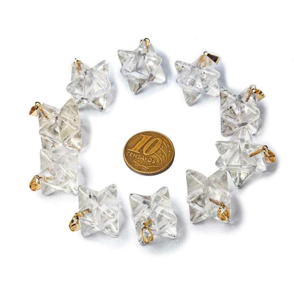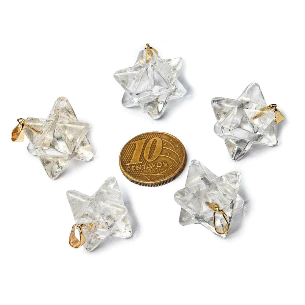 Lote com 100 Pingentes Estrela Merkaba em Quartzo Cristalino – Lapidação Artesanal com Pino Montado