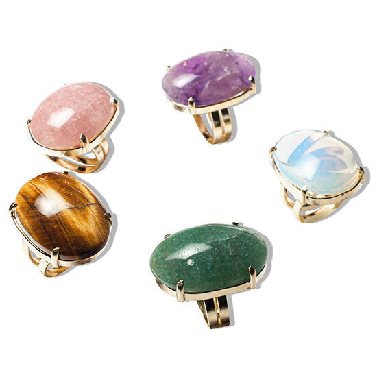 Adicione variedade e elegância ao seu estoque com este pacote de 5 Anéis Cabochão, cada um com pedras naturais e montagem manual. Com aro ajustável e uma seleção diversa de gemas, esses anéis são perfeitos para revenda e atendem a diferentes estilos e tamanhos.