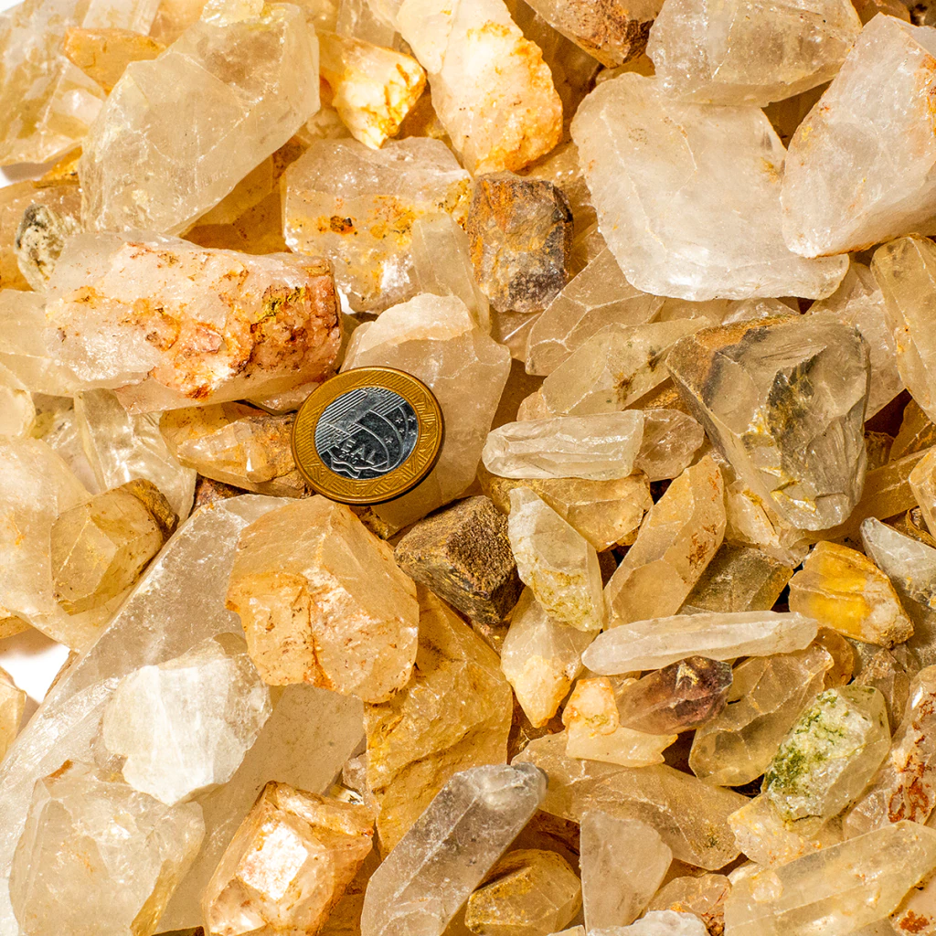 Lote com aproximadamente 5 kg de retalhos e cascalhos de quartzo branco, provenientes de garimpos e processos de lapidação. Ideal para uso em projetos de artesanato, decoração ou na fabricação de peças como orgonites.
