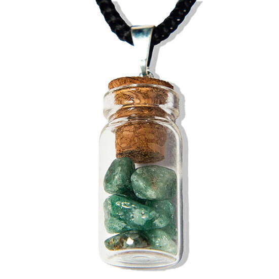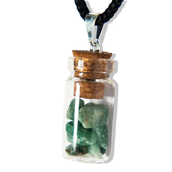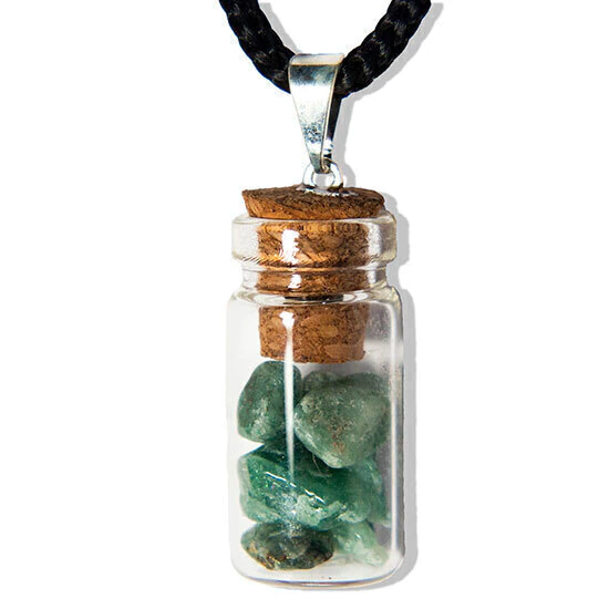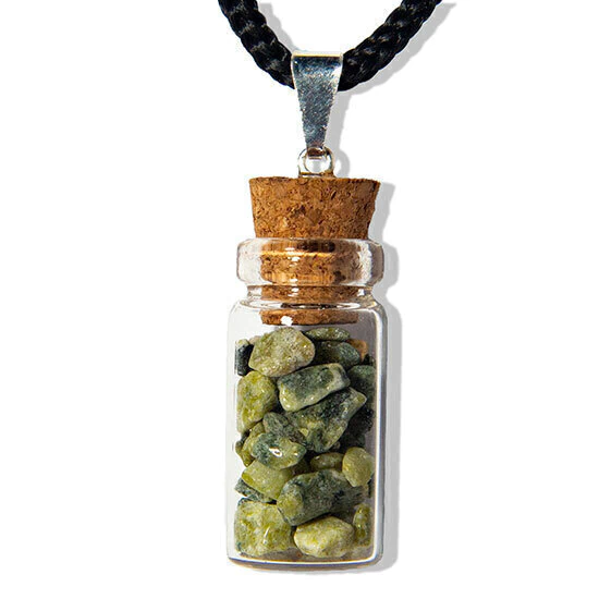 Amuleto de cura emocional e fisica para quem o utiliza. Presilha prateada com pedrinhas de Jade Verde rolado dentro da garrafinha de vidro.