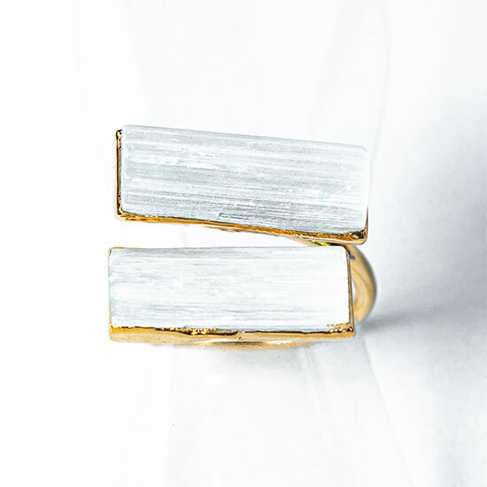 Anel ajustável dourado com 2 canudo de Selenita pedra esoterica, mineral natural branco que se assemelha a um canudo, trazendo beleza e estilo.