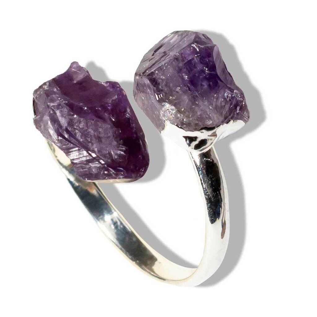 Anel Ajustável Prateado com Duas Ametistas Brutas – Beleza e Cura Natural