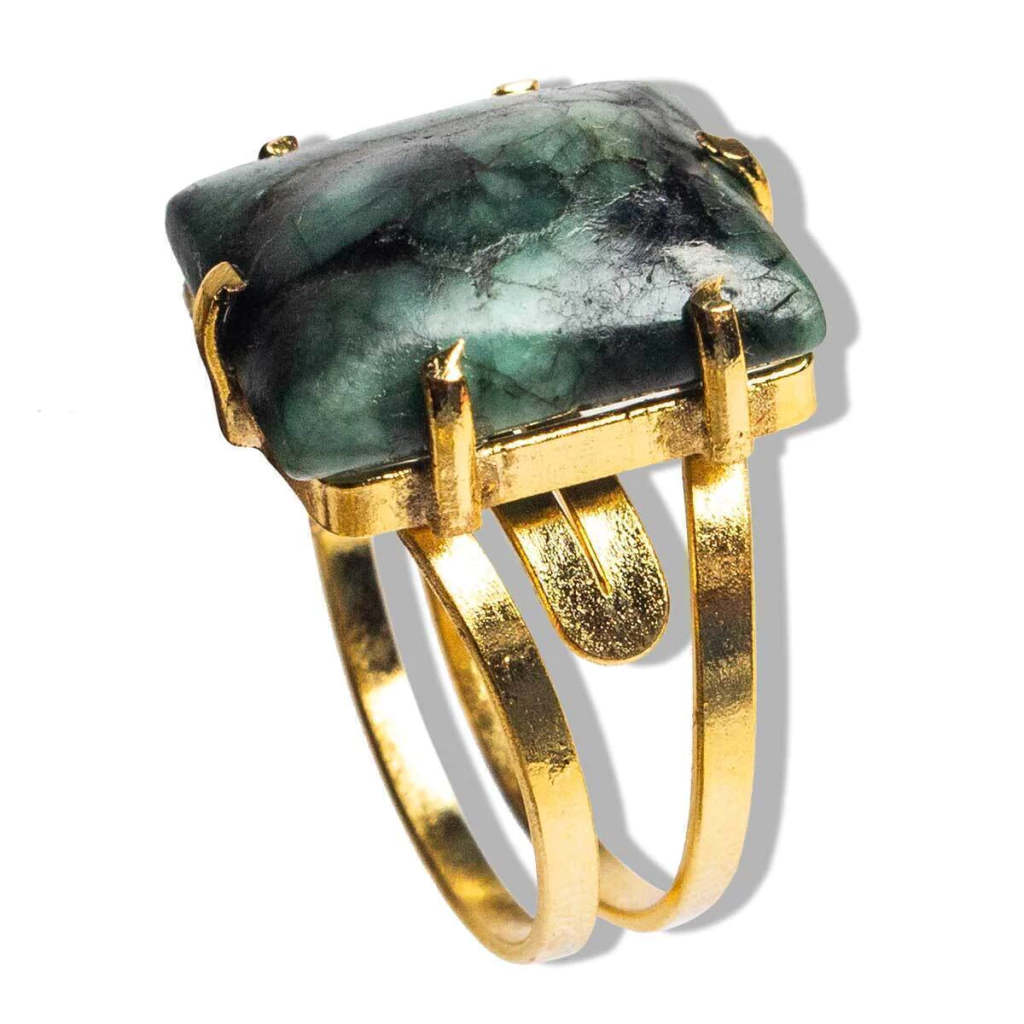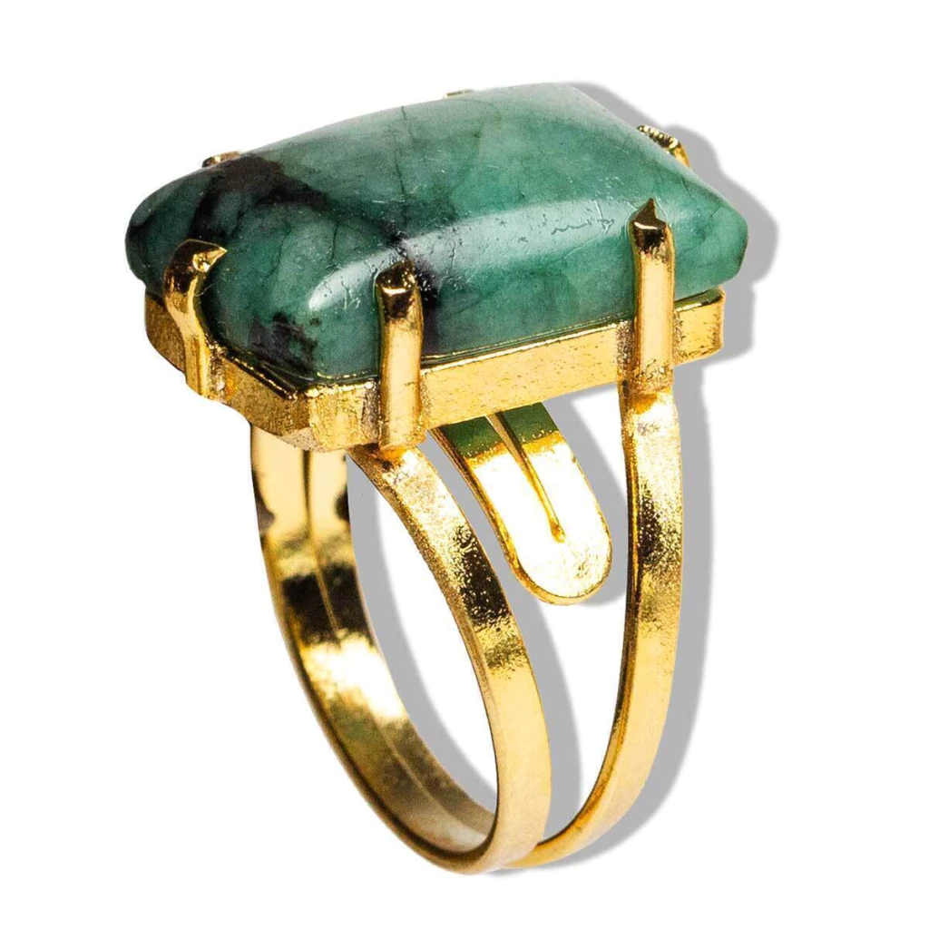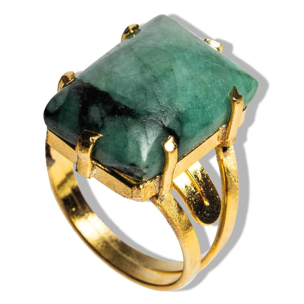 Anel Pedra Esmeralda Retangulo liso polido pra ganhar brilho tipo artesanal a montagem é com aro ajustavel ao dedo reforçado com banho em Flash dourado ouro, Lindo brilho serve do 12 ao 30