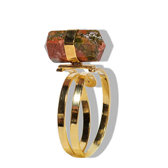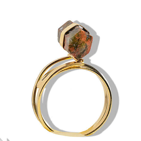 Anel Micro Pontinha Pedra Unakita Bi Ponta Aro Ajustavel Dourado, Anel Pedra Unakita natural de Garimpo com lapidação Manual Bi terminado Sextavado a montagem é com aro ajustavel ao dedo reforçado com banho em Flash dourado, Lindo brilho serve do 10 ao 30. Bi terminado são pontas com dupla terminação, ideais para usar no recebimento e envio de energia ao mesmo tempo, criando ponte energetica entre os cristais ao redor.