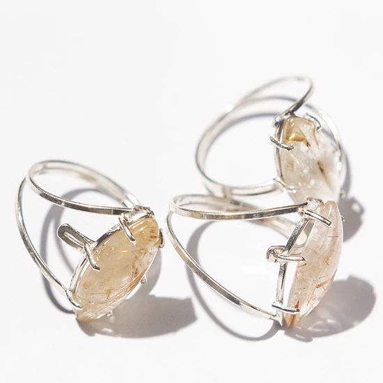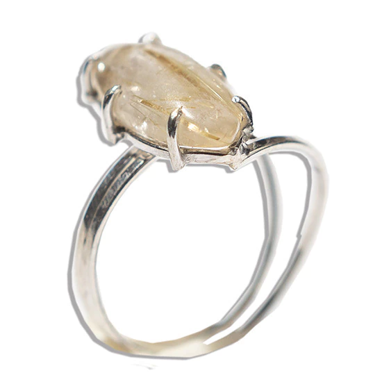 Anel Navete Pedra Rutilo no Quartzo 18mm Prata 950 Ajustável, Pedra Rutilo Dourado Incrustado no Quartzo Cristal Gema Cabochão Navete Liso Natural de garimpo, com lapidação manual aro ajustavel ao dedo serve do 10 ao 30 Prata de lei.