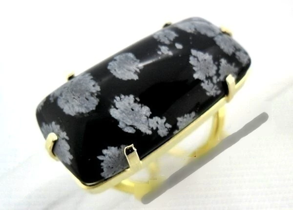 Anel Pedra Obsidiana Flocos de Neve Formato Cabochão Retangular Lapidação Manual estilo esmeralda aro ajustavel ao dedo serve do 14 ao 25
