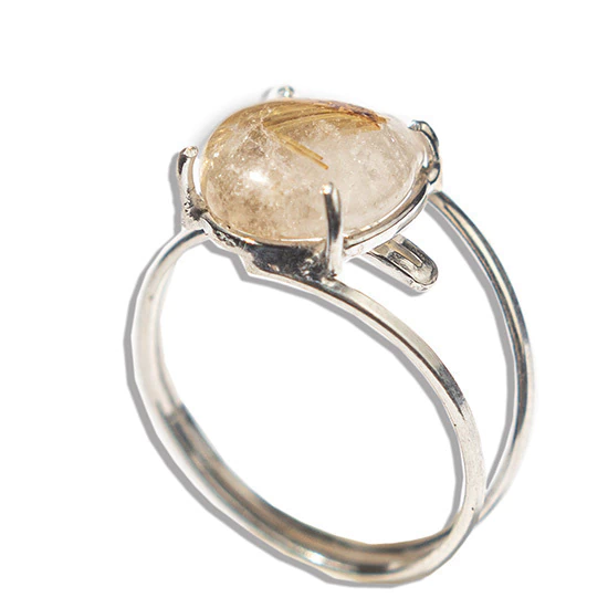 Anel Oval Pedra Rutilo no Quartzo Prata 950 Aro Ajustável, Pedra Rutilo Dourado Incrustado no Quartzo Cristal Gema Cabochão Oval Liso Natural de garimpo, com lapidação manual aro ajustavel ao dedo serve do 10 ao 30 Prata de lei.