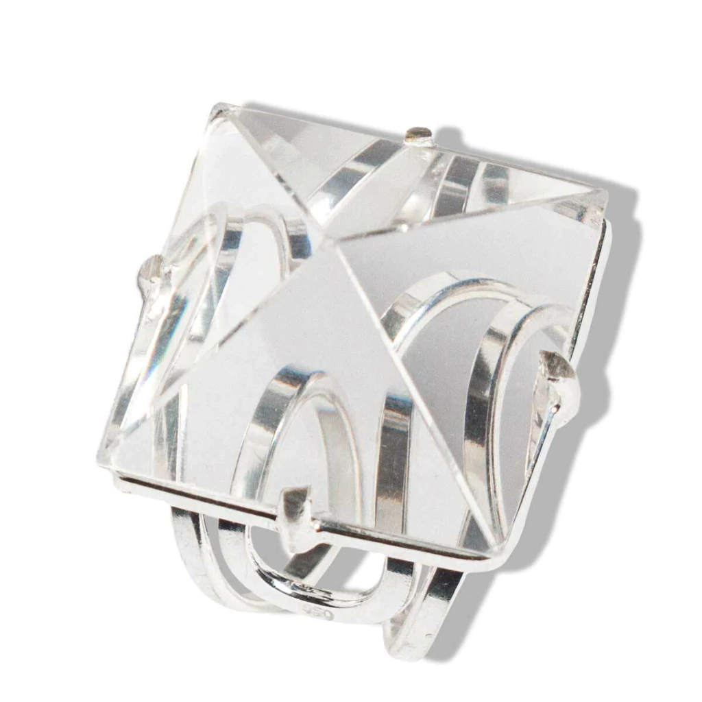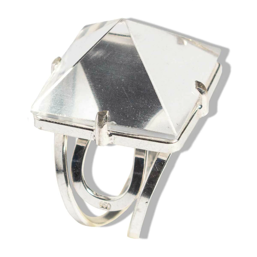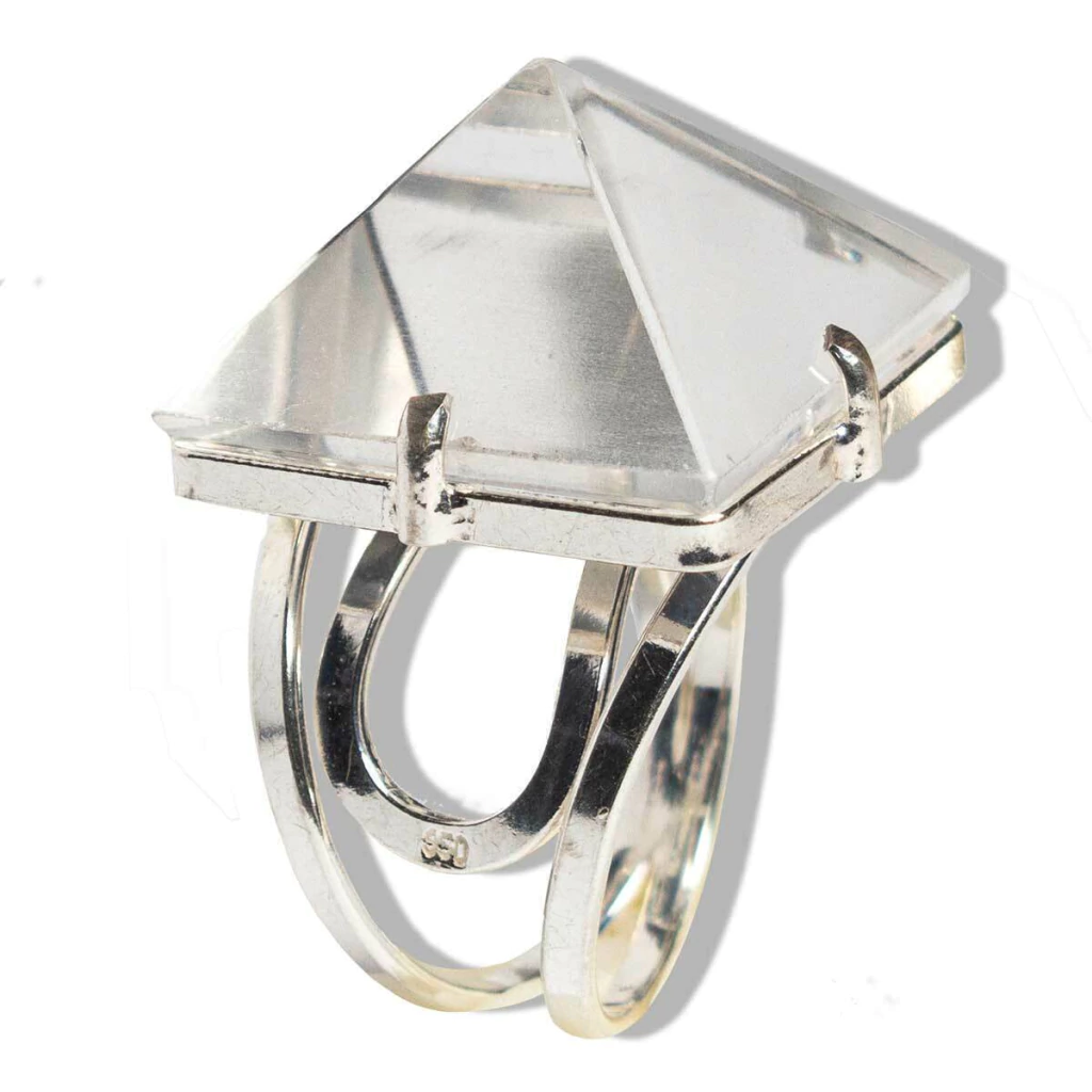 Anel Pirâmide de Cristal inspirado na Grande Quéops. Montagem em prata 950 com aro ajustável do tamanho 10 ao 30. Elegância e energia em uma peça única.