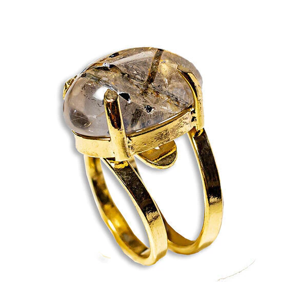 Anel Turmalina no Cristal Cabochão Oval 20mm Banho Dourado, Peça Natural Cristal com Turmalina Preta Incrustada Cabochão Oval Tamanho Pequeno Pedra com Lapidação Manual tipo artesanal com excelente brilho e com um design sóbrio, Montado com aro ajustavel ao dedo reforçado banhado em Flash dourado, Lindo brilho serve do 10 ao 30