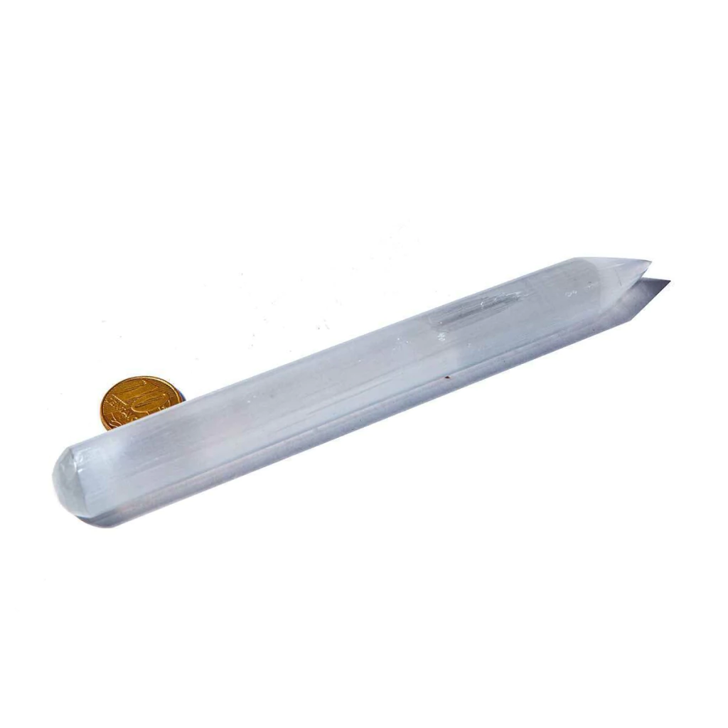 Bastão de lápis de selenita: cristal natural com propriedades de limpeza energética e clareza mental. Excelente para meditação e cura.